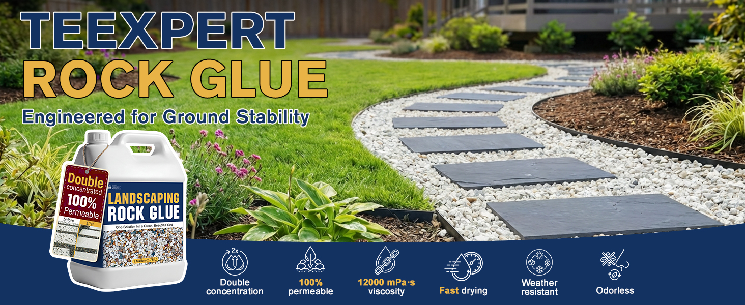 【Reduced Maintenance Frequency】Teexpert rock glue for landscaping has a wide range of applications. It can be sprayed or poured over gravel in flower beds, slopes, sidewalk gaps, tree rings, patios, walkways, driveways, pool edges, landscape borders, and other outdoor areas.It helps secure pebbles and gravel, preventing shifting and reducing cleanup after heavy rain or strong winds. Ideal for DIY landscaping projects and garden border maintenance.By keeping stones firmly in place, it makes leaf blowing and yard cleaning easier without scattering gravel. Say goodbye to the frustration of “just cleaned up and it's messy again,” and avoid repeated maintenance work.
