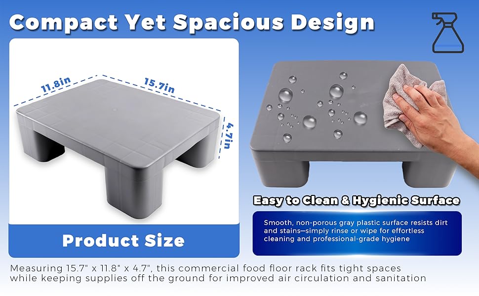 Compact Yet Spacious Design: Measuring 15.7" x 11.8" x 4.7", this commercial food floor rack fits tight spaces while keeping supplies off the ground for improved air circulation and sanitation