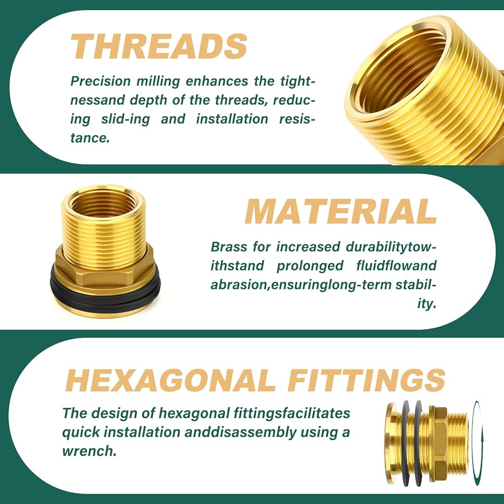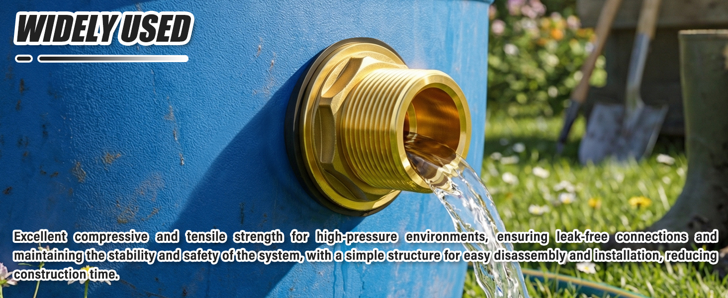 Material Features: This brass bulkhead tank connector offers excellent corrosion resistance, high-temperature ductility, and low magnetic permeability. The dual-thread design combined with a leak-resistant seal (featuring two rubber rings) ensures a reliable connection for water storage systems.