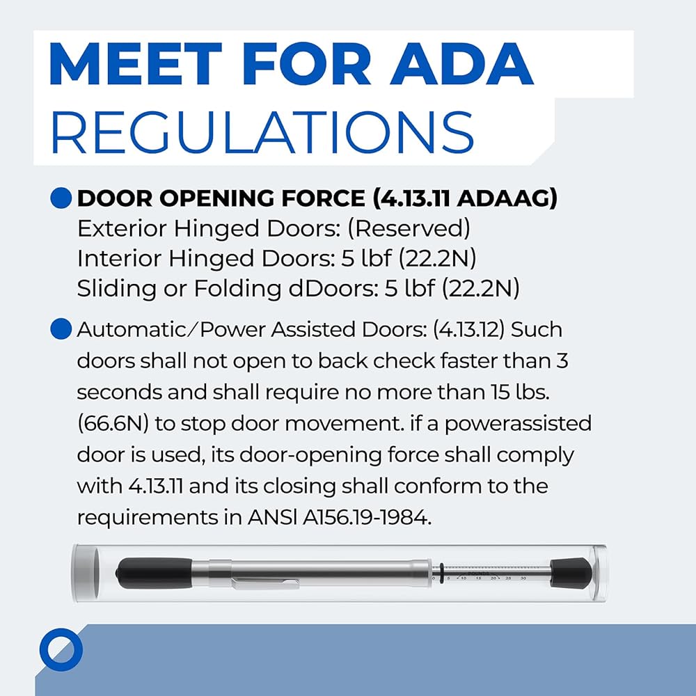 Meet for ADA Requirement: Engineered to comply for ADA guidelines, this door pressure gauge helps verify that door-opening force falls within the required 5–35 pound range: exterior doors: reserved; interior doors: 5lbf (22.2N); sliding or folding doors: 5 lbf (22.2N). It's a useful tool for ensuring accessibility, passing inspections, and maintaining compliance in public and commercial facilities.