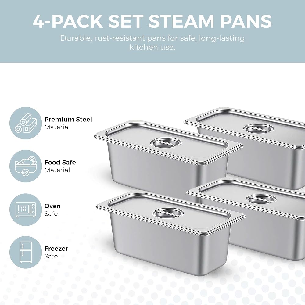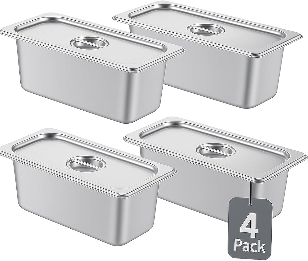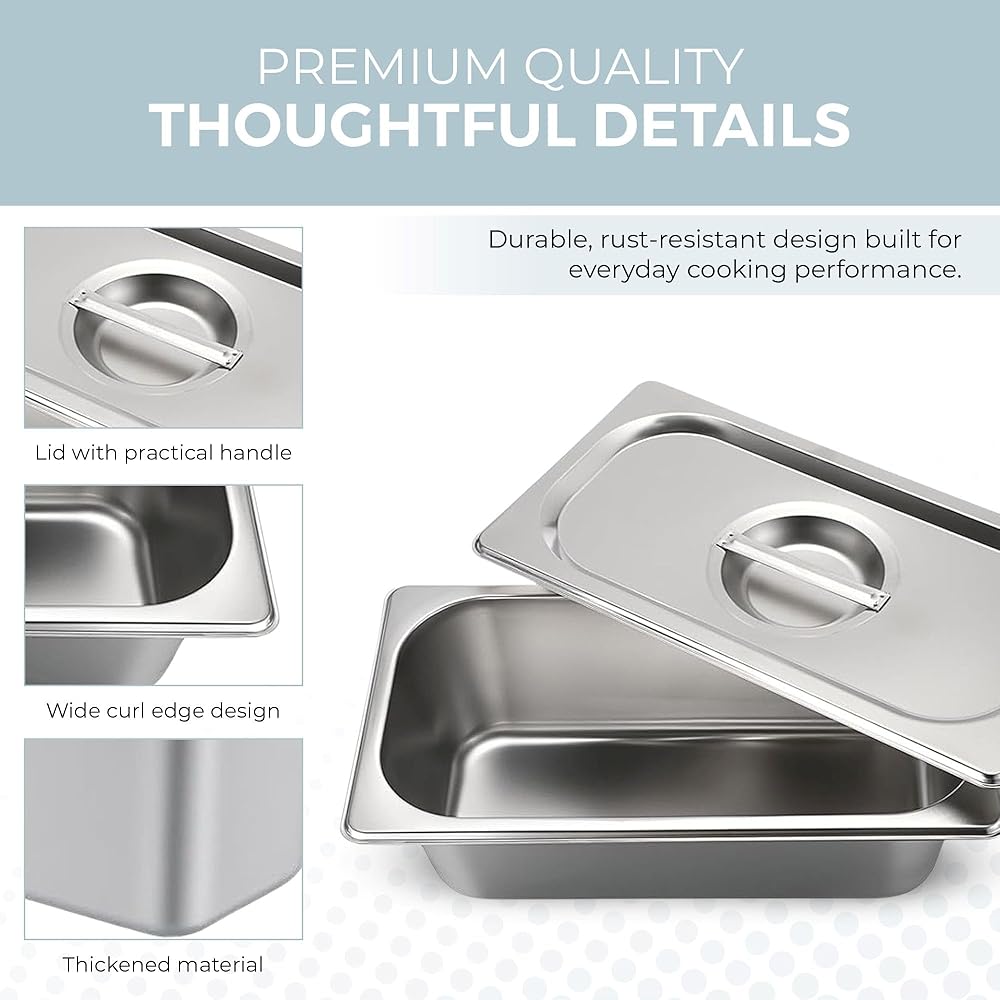 ALPHA LIVING 4 Pack Stainless Steel Steam Table Pans with Lids, 1/3 Size 6" Deep Hotel Pans for Catering, Buffet, Restaurant, or Home Use – Durable Anti-Rust Reusable Food Storage Trays