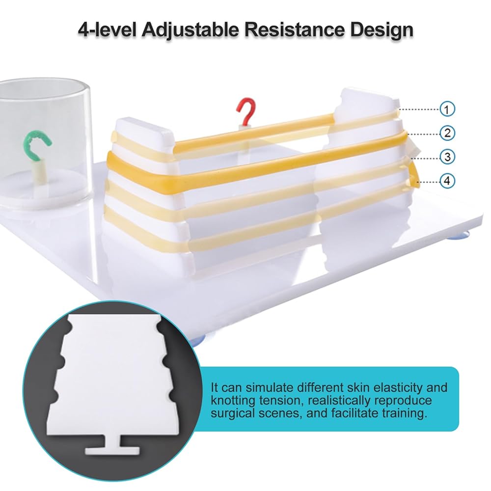 4-level adjustable resistance design that simulates varying skin elasticity and knot tension, realistically replicating surgical scenarios for training purposes.