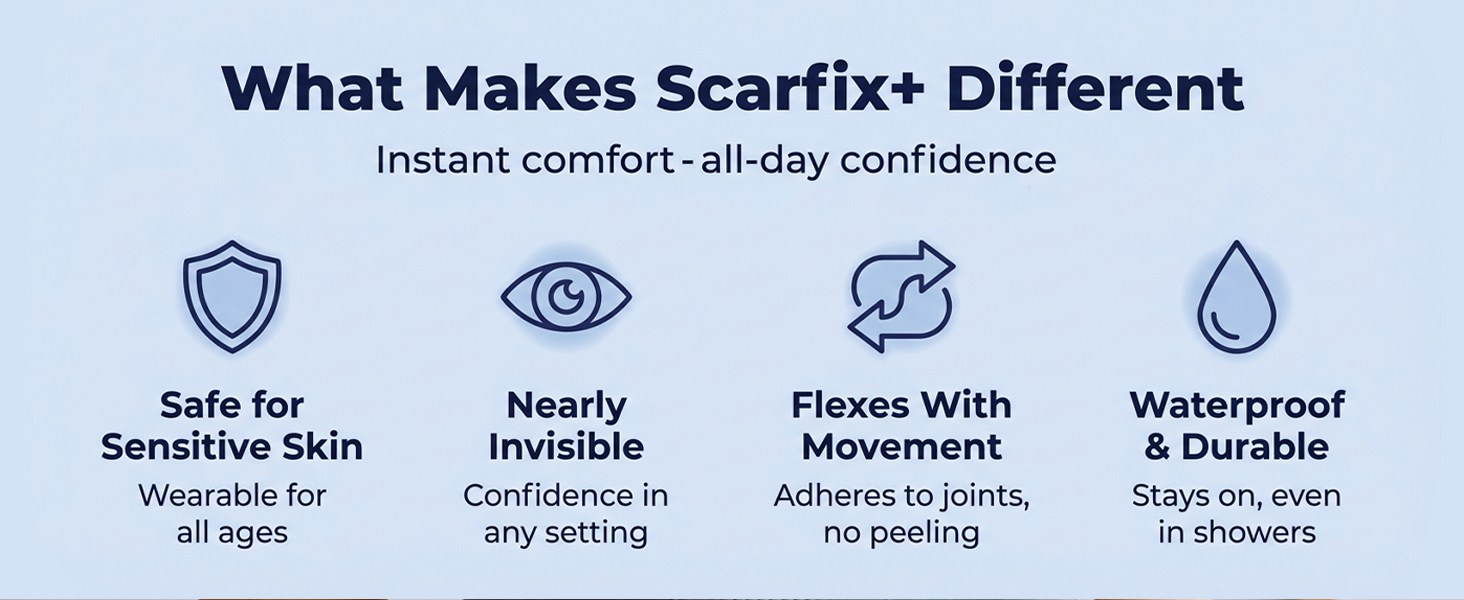 𝐓𝐫𝐮𝐬𝐭𝐞𝐝 𝐀𝐥𝐭𝐞𝐫𝐧𝐚𝐭𝐢𝐯𝐞 𝐭𝐨 𝐒𝐜𝐚𝐫 𝐂𝐫𝐞𝐚𝐦𝐬 & 𝐆𝐞𝐥𝐬: Clinically backed silicone acne scar treatment therapy trusted by professionals worldwide. ScarFix scar tape for surgical scars helps reduce redness, texture, and discoloration faster than traditional creams - providing a durable, breathable, and reusable solution for visible scar improvement.