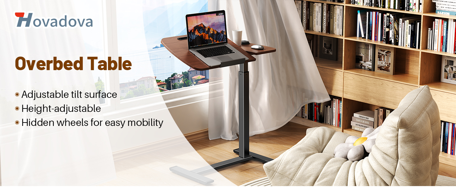 Pneumatic Height Adjustment: Hovadova Overbed Bedside Table Features built-in pneumatic gas springs for effortless one-handed height adjustment. Flexible range from 28.74 to 42.72 inches. No more bending over. Fully compatible with sitting, lying, working, and standing modes. Achieve comfort and convenience in one simple step