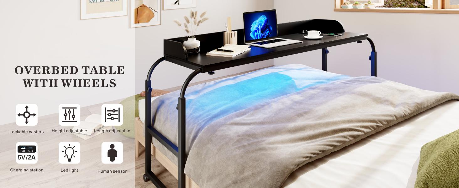 Smart 3-Color LED Sensor Light: Overbed desk queen size bed table offers 3 modes lights(white, blue, yellow) and a built-in motion sensor that can be turned on/off. It lights up at night to help you find items easily and avoid fumbling in the dark, making it very practical for daily use