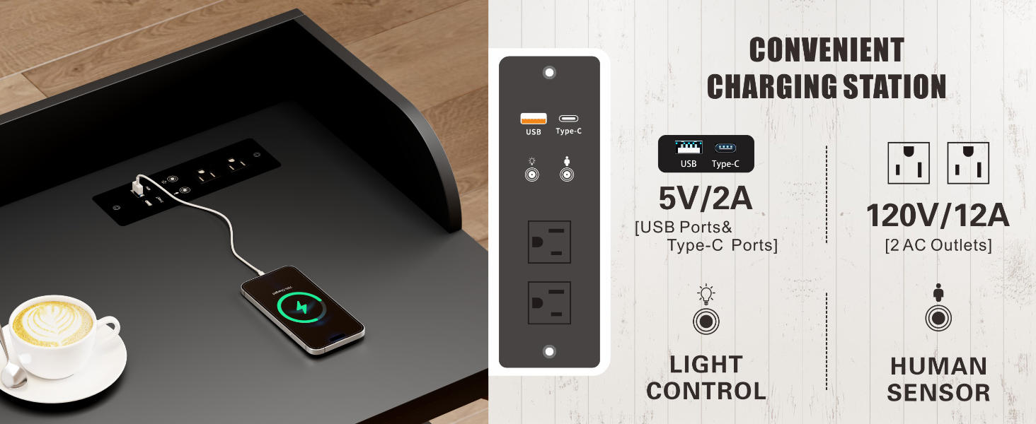 Convenient Charging Device: Adjustable overbed table with charging station features 1 Type-C port, 1 USB port, and 2 AC outlet. It can simultaneously charge laptops, mobile phones, and other portable devices, effectively meeting power requirements for work, study, leisure and other scenarios