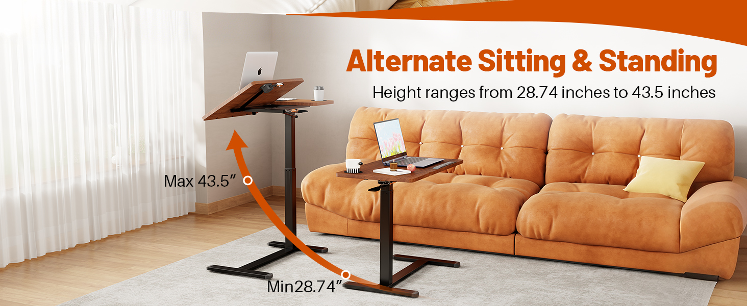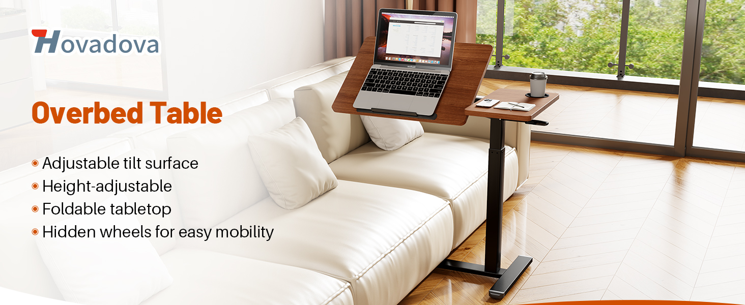 Gas Spring Pneumatic Lift System : This Hovadova overbed bedside table features a smooth pneumatic lifting system that allows for easy height adjustment from 28.74 inches to 43.5 inches with just one hand. It can be quickly adjusted to suit various postures and reduce discomfort.