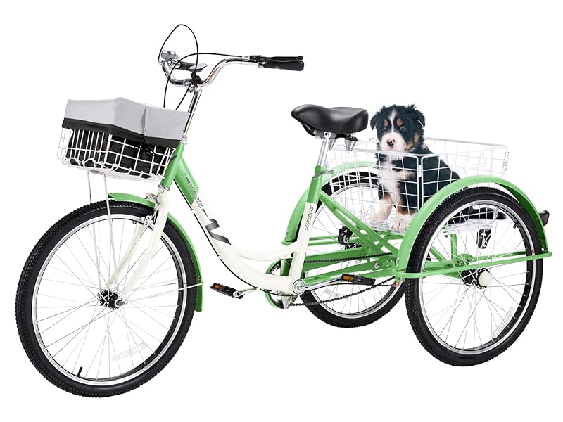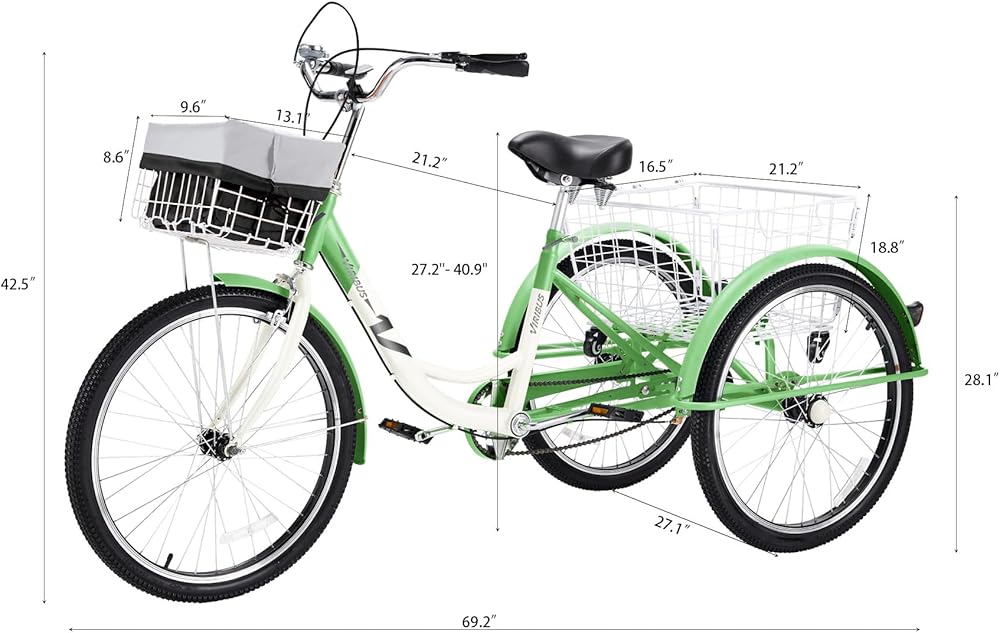 VIRIBUS Adult Tricycles for Women, Single Speed Tricycle for Adults with Front & Rear Detachable Wheeled Baskets, 3 Wheel Bikes for Adults Seniors 1 Speed, 400 lb. Capacity Three Wheeler, 26 in.