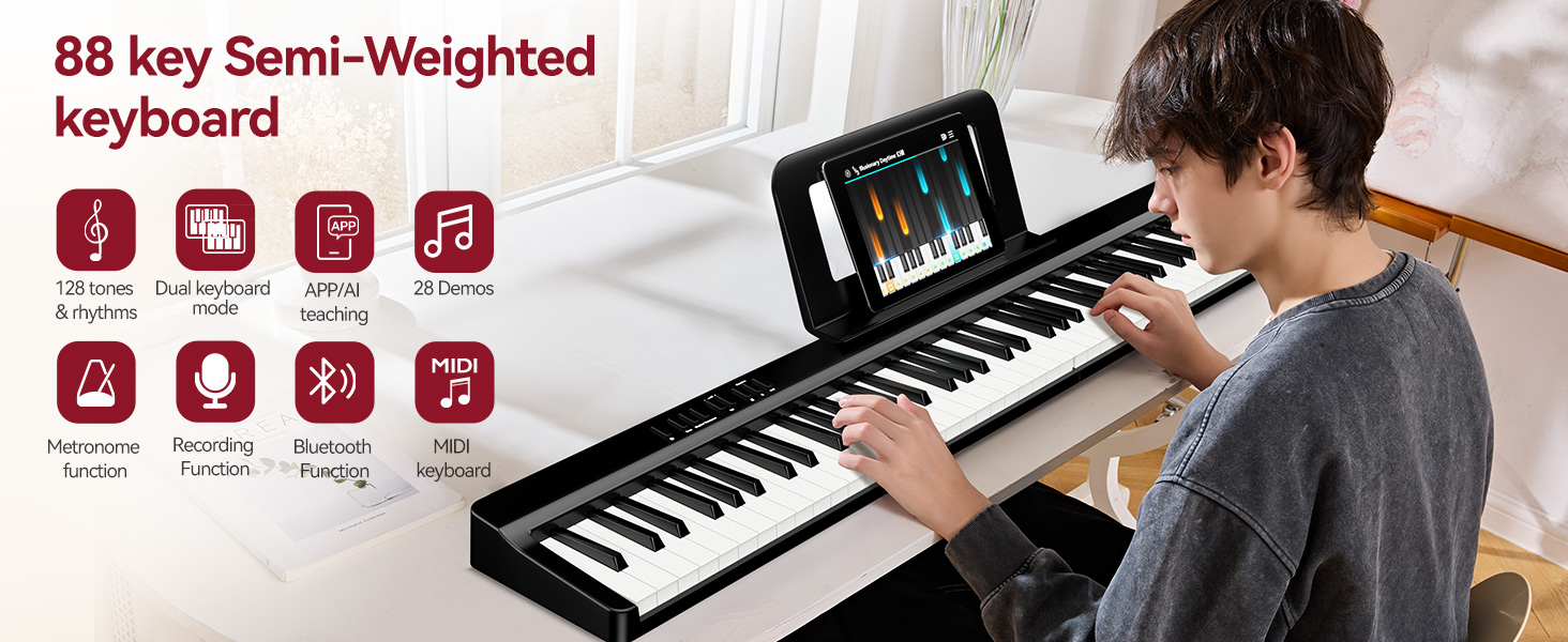【88-Key Semi-Weighted Keyboard】Enjoy an authentic piano-playing experience with semi-weighted keys that mimic the depth and responsiveness of an acoustic piano. The enhanced sensitivity ensures dynamic control, allowing you to express every note with emotion and precision perfect for beginners and seasoned players.