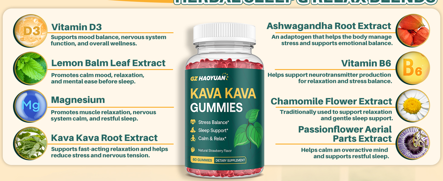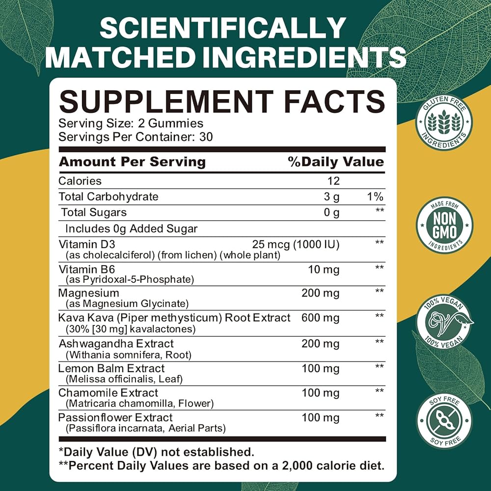 🌙【6-in-1 Herbal Kava Gummies for Calm & Relaxation】- This thoughtfully balanced formula combines Kava Kava, Ashwagandha, Lemon Balm, Chamomile, Passionflower, and Magnesium Glycinate to support relaxation, emotional balance, and a peaceful state of mind. Enhanced with Vitamin B6 (P-5-P) and plant-based Vitamin D3 (from lichen) for daily mood and wellness support