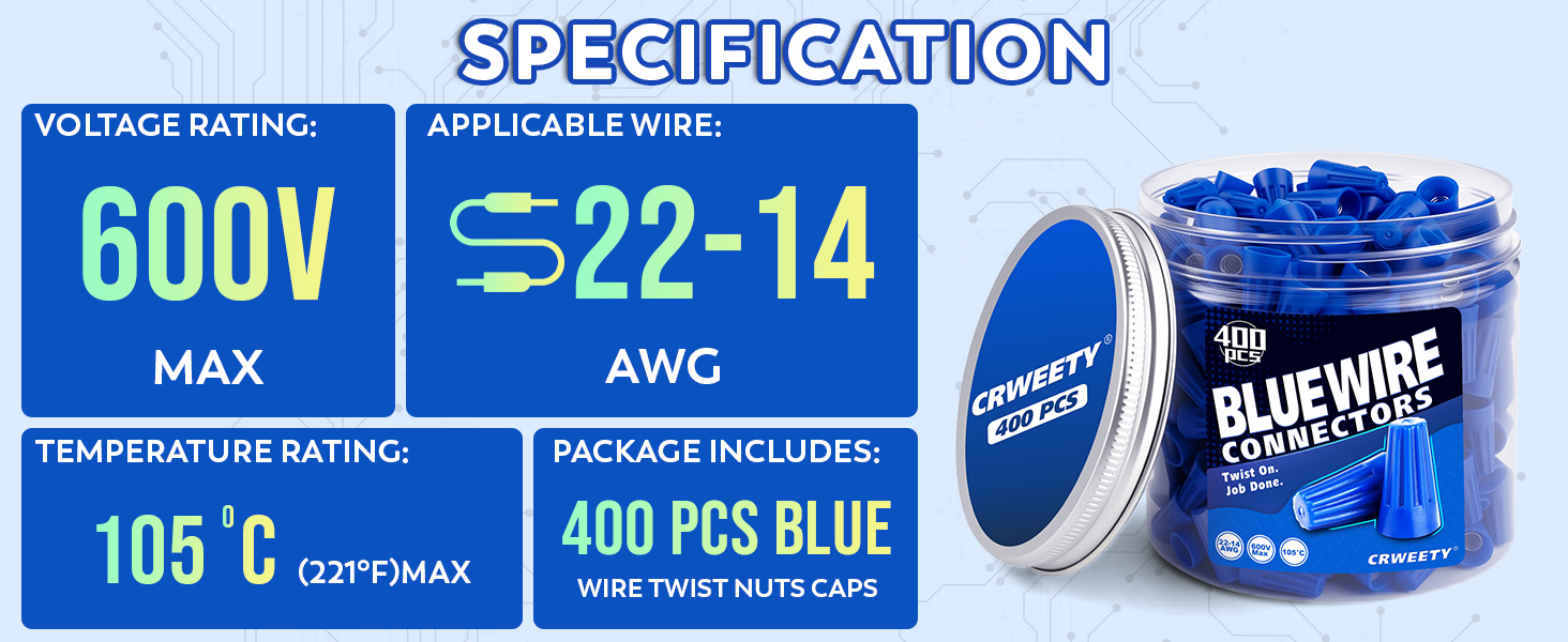 Package includes: 400 Pcs Blue insulated electrical caps, 22-14 AWG. Verify wire size and terminal type to match the wire cap to the wire gauge.