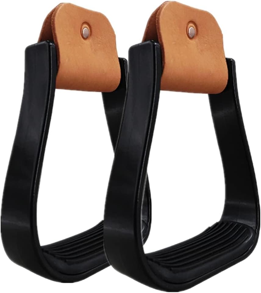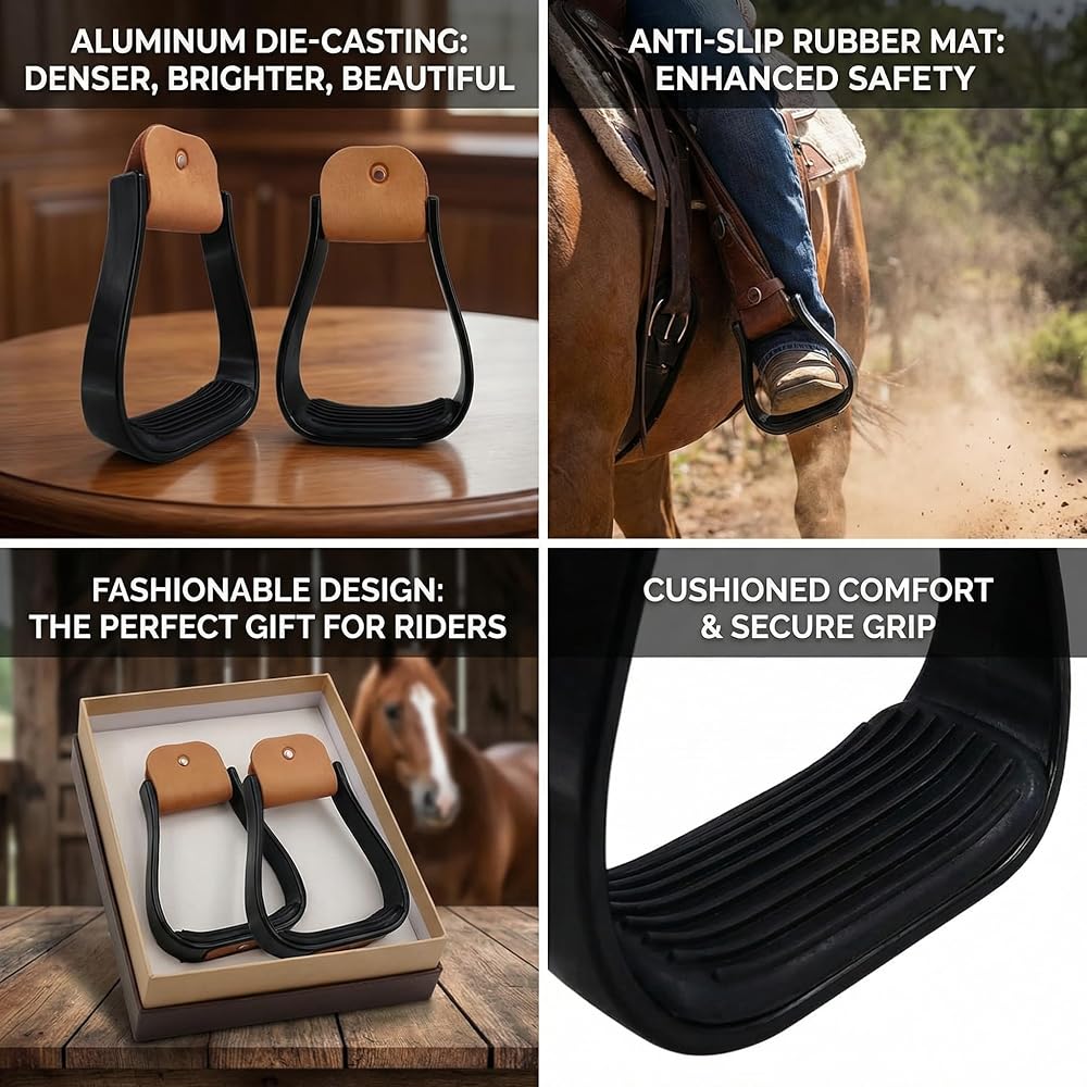 Anti-Slip Safety Feature: Equipped with a textured rubber foot mat, these stirrups prevent slipping even in wet or muddy conditions. The genuine cowhide-covered top enhances grip, while the reinforced base ensures secure footing.