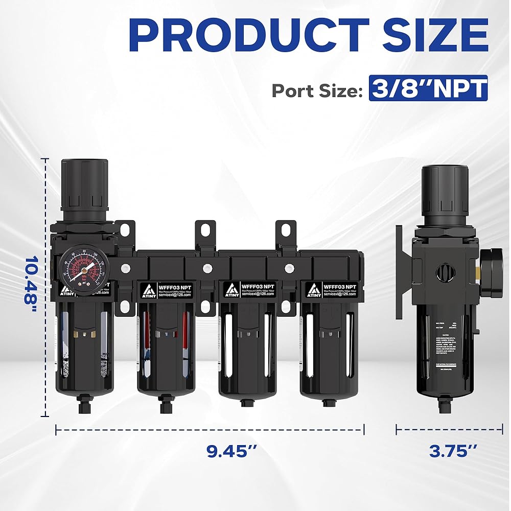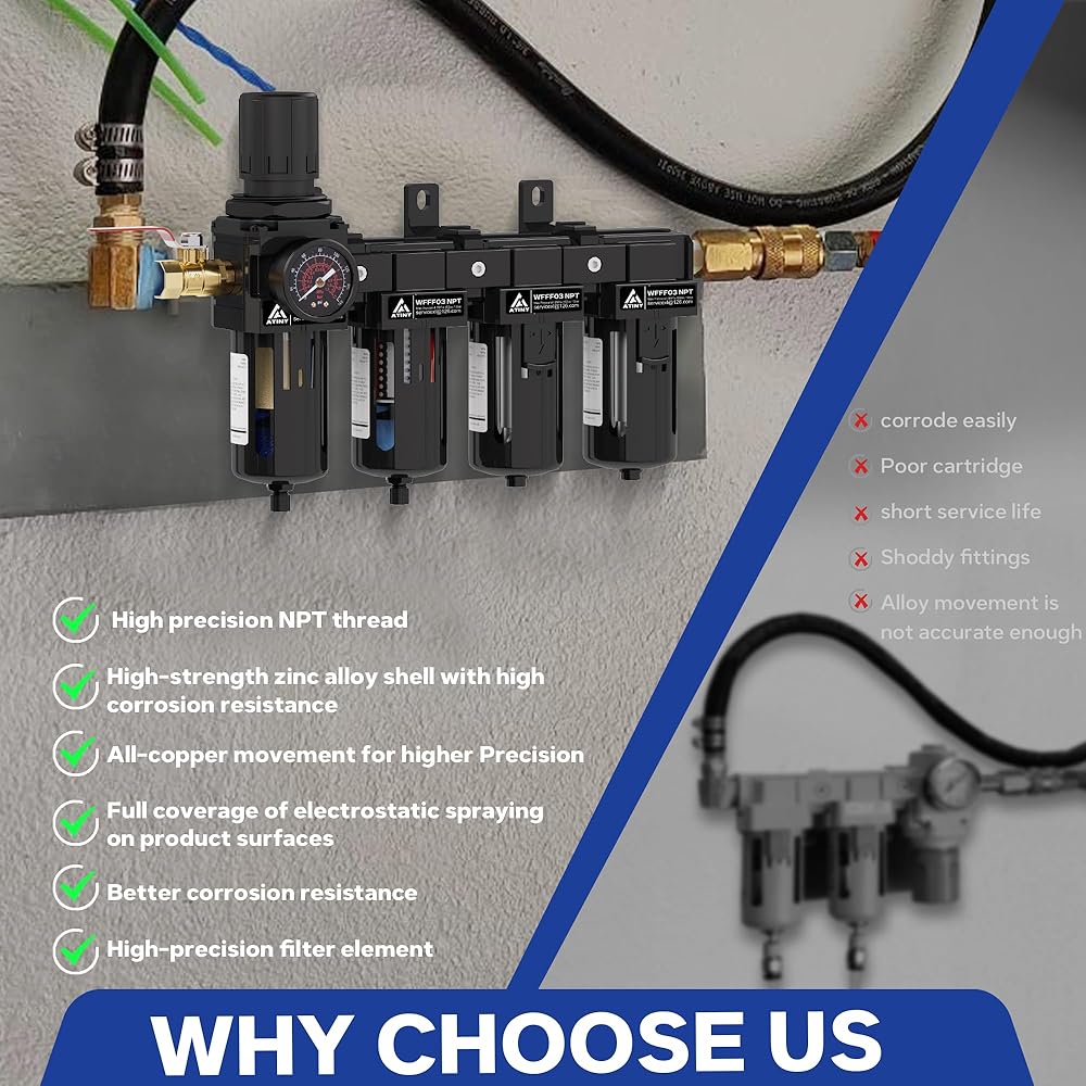【Stage 1 Regulator & Filter】The primary filtration adopts 5 micron brass filter element, which can filter 98.63% of the impurities oil and water in the air, and the brass filter element can be disassembled and cleaned for reuse, which saves your cost.