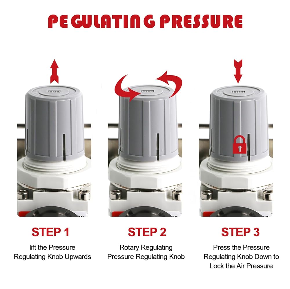 【Features】To lower or maintain air pressure; When regulating pressure, pull up the rotary knob and rotate clockwise to increase the pressure and rotate anticlockwise to decrease the pressure.
