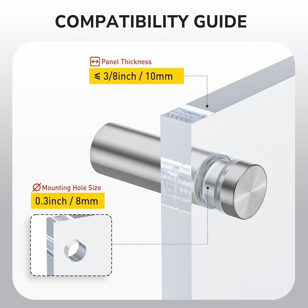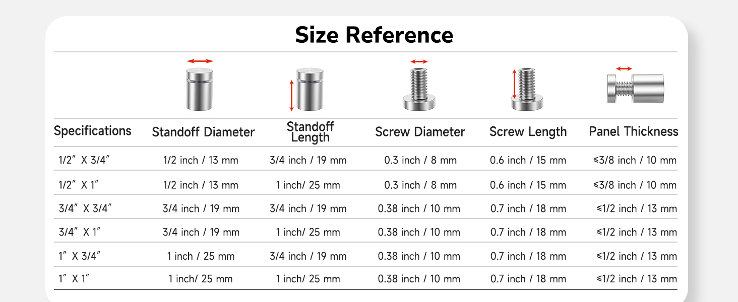 • 【Great Value Pack】Includes 8 pcs Diameter 1/2 in. Base Length: 1 in. Cap Height: 1/4 in. 1/2" x 1"(13mm × 25mm) standoff screws and all required mounting hardware; each sign holder standoff comes with 2 rubber cushions to protect your sign while keeping it mounted securely and neatly