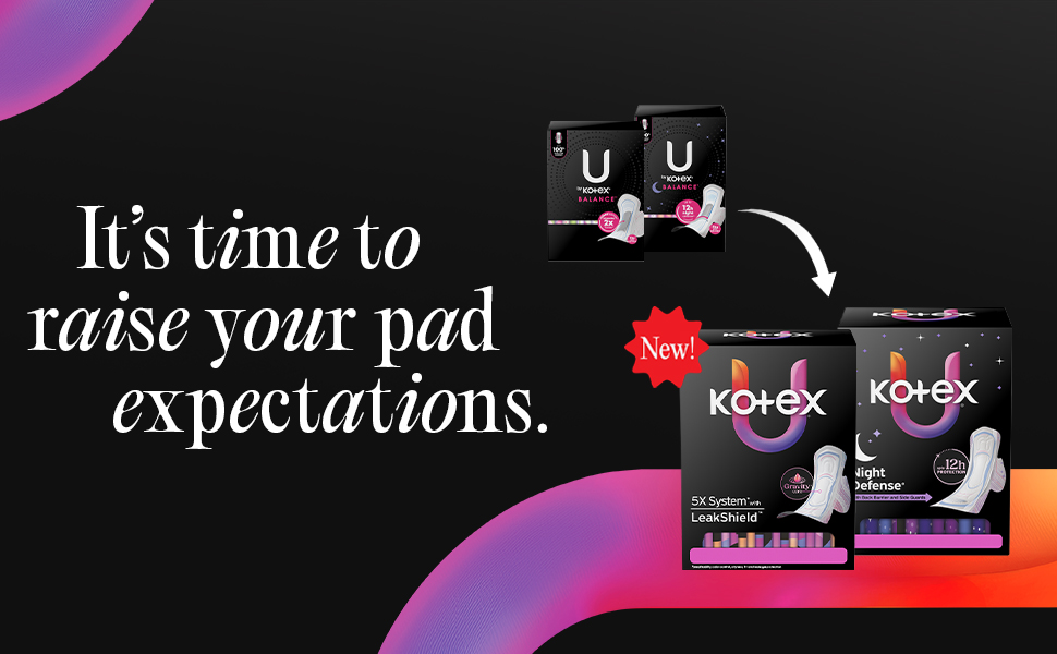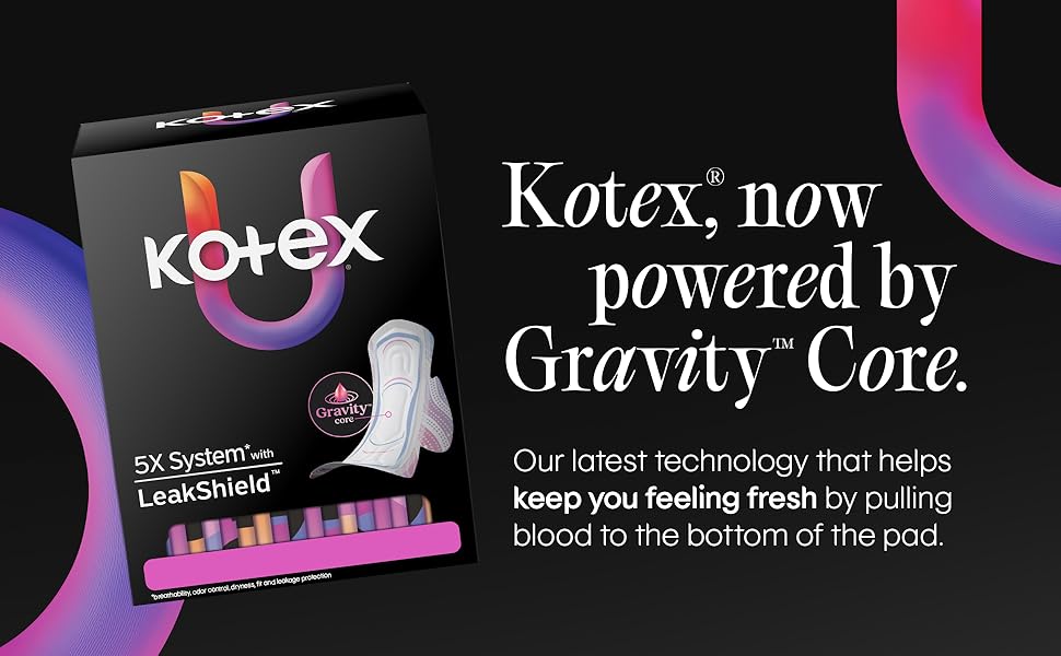 Bring powerful protection and comfort to your period routine with the new Kotex Ultra Thin Pads. The 5x System with LeakShield Protection delivers breathability, odor control, dryness, fit and leakage protection for up to 100% Leak Free Comfort. These period pads are designed for a perfect fit and combine LeakShield Technology, a breathable top layer, a new Gravity Core and odor control to give you a menstrual pad that protects you in more ways than one. To help keep you feeling clean and fresh throughout your day, each feminine pad is designed with a Gravity Core that pulls period blood to the bottom of the pad. Each women's pad is made with your skin health in mind, which is why these pads are made without fragrance and free of elemental chlorine. For overnight protection in any sleep position, check out Kotex Ultra Thin Overnight Pads. Kotex feminine products are FSA/HSA/HRA-eligible in the US. Packaging may vary from images shown.