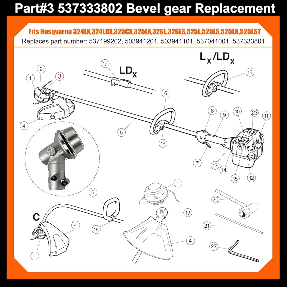 - 537199202 537333802 537333801 Trimmer Weed Eater Bevel Gear Head Assy For Husqvarna String Trimmers Model 327LDX, 327RX, 525L, 525LST, 326L, 326LS,326RJX, 326SX, 324LX,522L, 325iLK, 325R, 324LX, 325iLK, 525RX, 525LK, 525RK,525RXT also fits for RedMax Trimmer BCZ260S,GT2125L, BCZ250S
