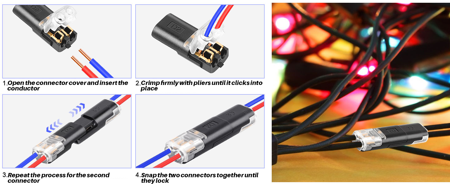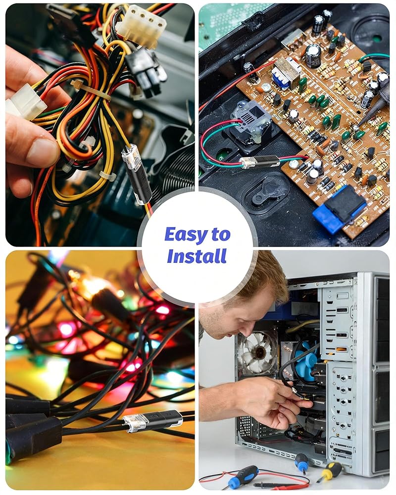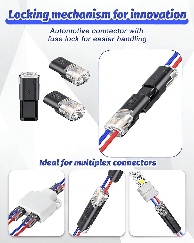 【5-Second Fast Wiring】Cut wiring time by 80%! No stripping/crimping—just lift the lock, insert wires, snap it shut, and enjoy a secure connection. Built-in test holes let you check circuits without disassembling the connector.