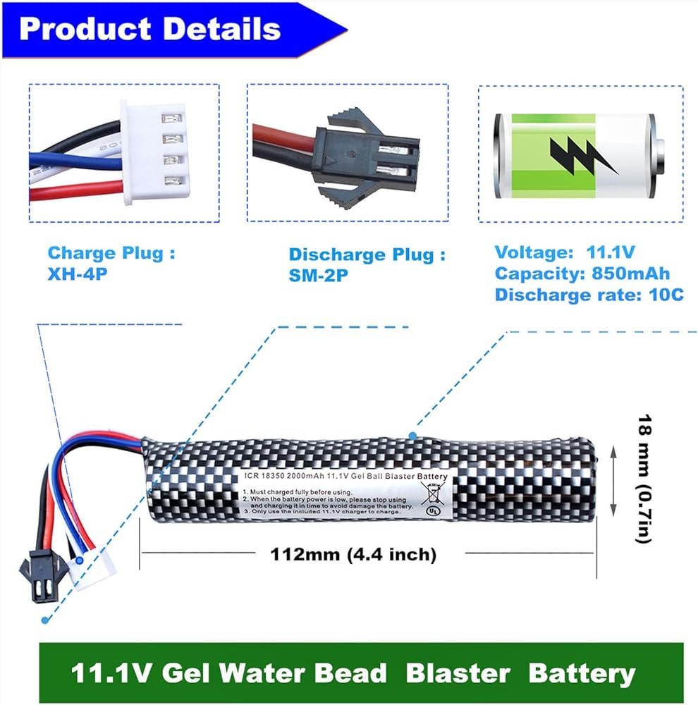 【Wide Application 】: 11.1V 850mAh li-ion batteries compatible with Airsoft Gel Water Bead Blaster splatter. (Only if the voltage, dimension and the plug match, then it will fit)