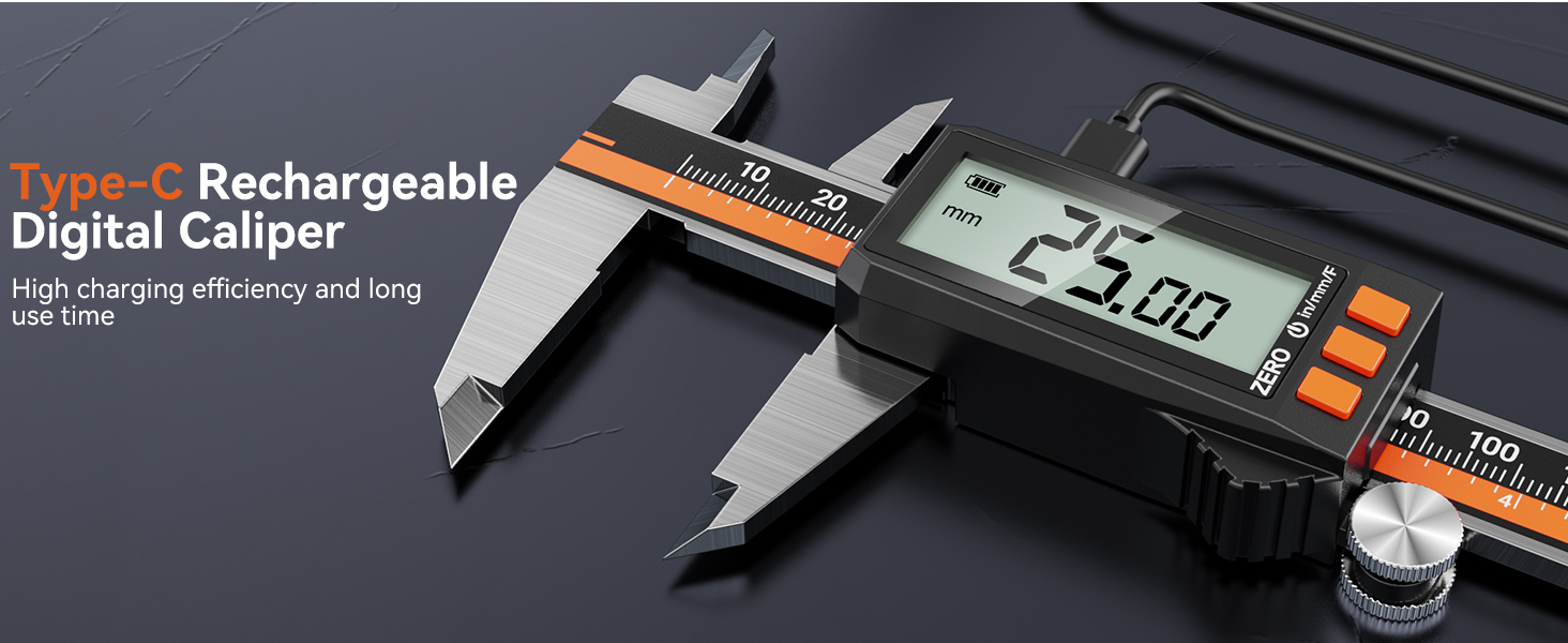 TYPE-C RECHARGEABLE DESIGN: The caliper has a built-in high-efficiency lithium-ion battery that can be recharged quickly, eliminating the need for frequent battery replacements, long use time, saving energy. (Charge fully in 50 minutes)