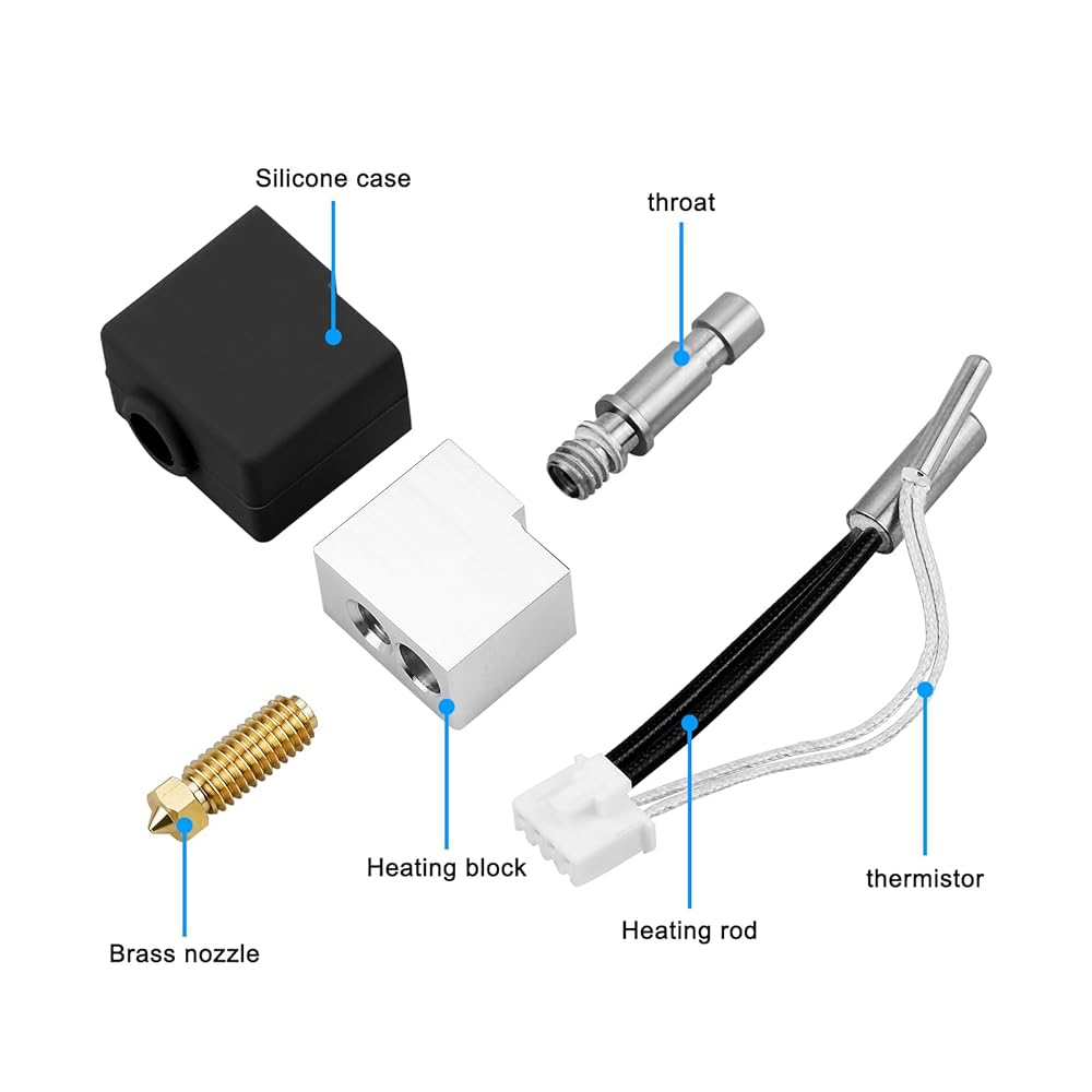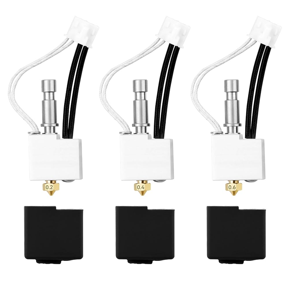 Package Included: 1 set 0.2MM hotend kit + 1 set 0.4MM hotend kit + 1 set 0.6MM hotend kit (heater cartridge, thermistor, heat block,throat tube, nozzle, silicone cover)