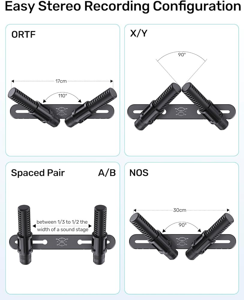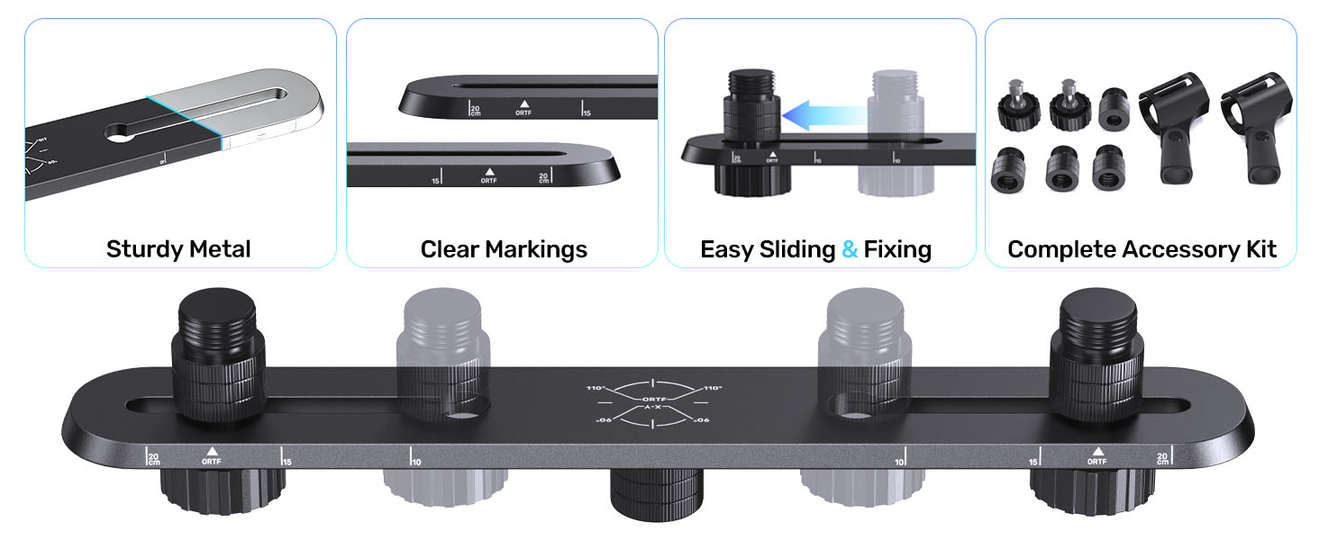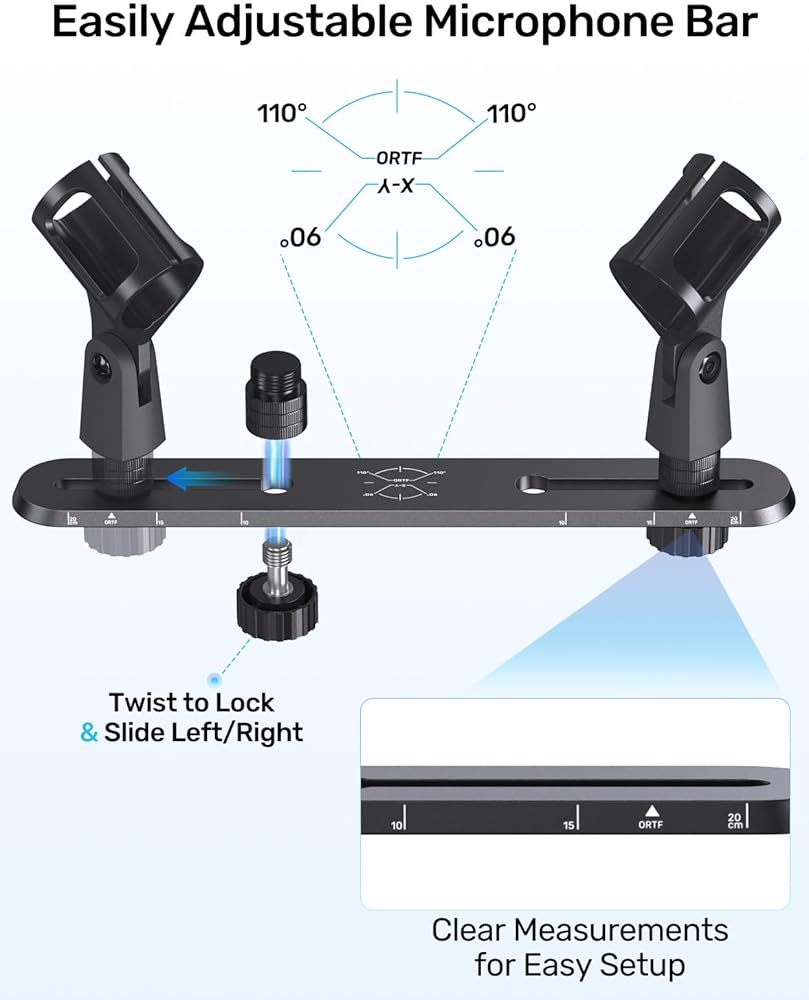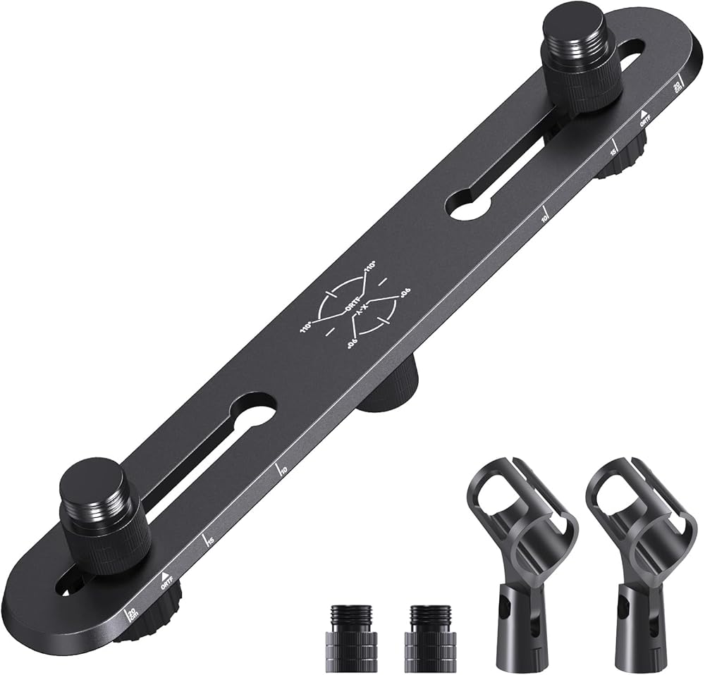 【Simplified Stereo Array Setup in Seconds】Achieve professional XY, ORTF, and NOS configurations with unparalleled ease. Our stereo array spacing microphone holder features clear, ruled spacing markings in centimeters for precise microphone placement. With tool-free installation and angle-adjustable microphone clips, you can complete your stereo array setup quickly. This stereo microphone bar makes complex stereo recording techniques accessible to everyone, from content creators to audio engineers.