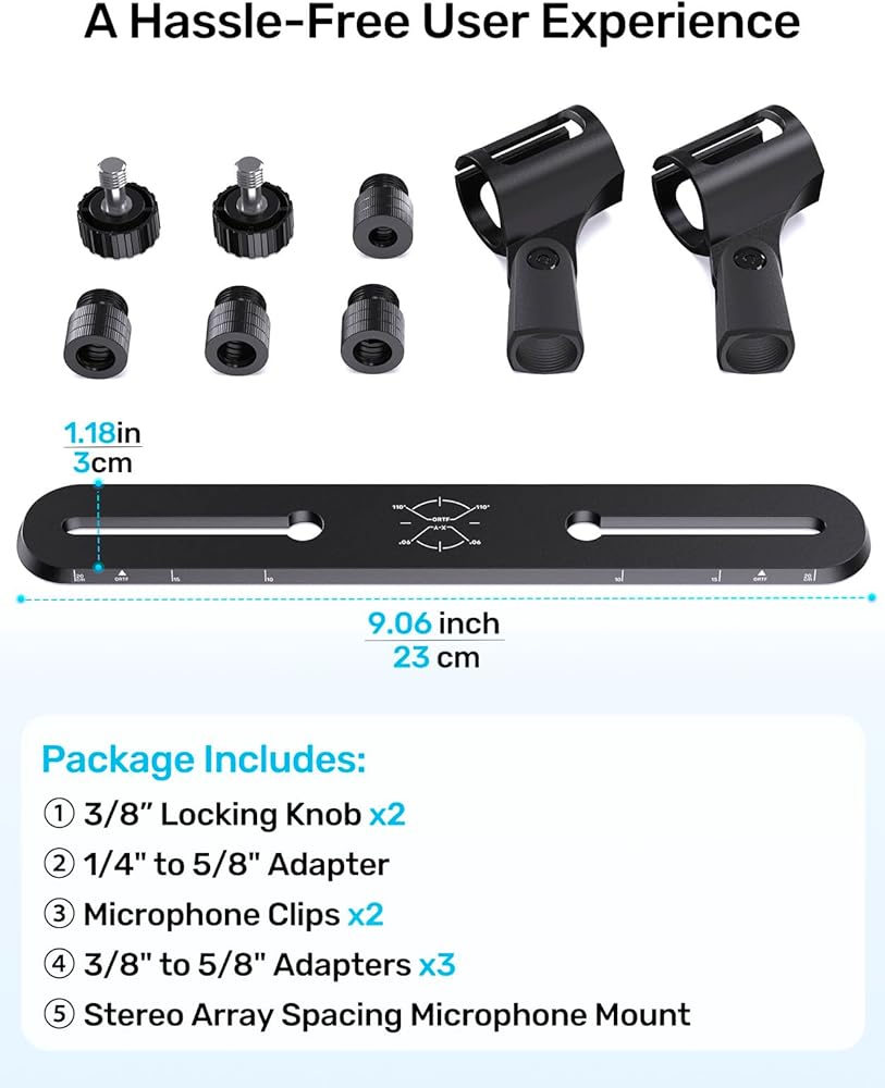 【Portable & Complete All-in-One Kit】Take your professional stereo recording setup anywhere. The package includes your Stereo Array Spacing Microphone Mount, 2x Adjustable Microphone Clips, 1x 1/4" to 5/8" Adapter, and 3x 3/8" to 5/8" Adapters - everything required for an instant professional multi-mic setup. Designed for content creators on the move, this compact kit effortlessly fits in your gear bag, making it ideal for mobile podcasting, on-location interviews, and spontaneous music recording sessions.