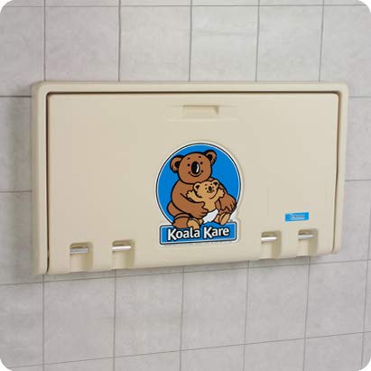 Koala Kare stainless steel clad, surface-mounted, horizontal-folding baby changing station with grey polyethylene interior. Built to meet or exceed the stringent standards set by public and private regulatory agencies. Concealed gas spring / pneumatic cylinder mechanism ensures smooth, controlled opening and closing. Built-in liner cavity / dispenser and two built-in bag hooks. Includes child protection straps (replaceable). Constructed with 55% recycled materials. Backed by Manufacturer's Five-Year Limited Warranty on Materials and Workmanship Made in the U.S.A