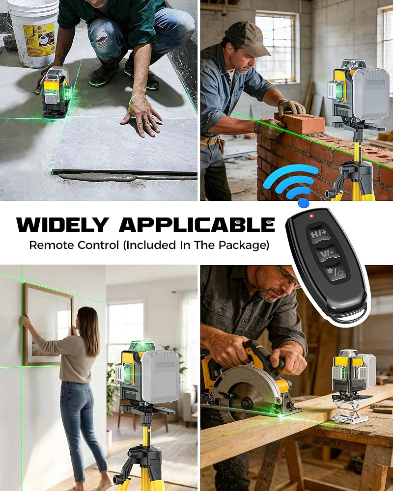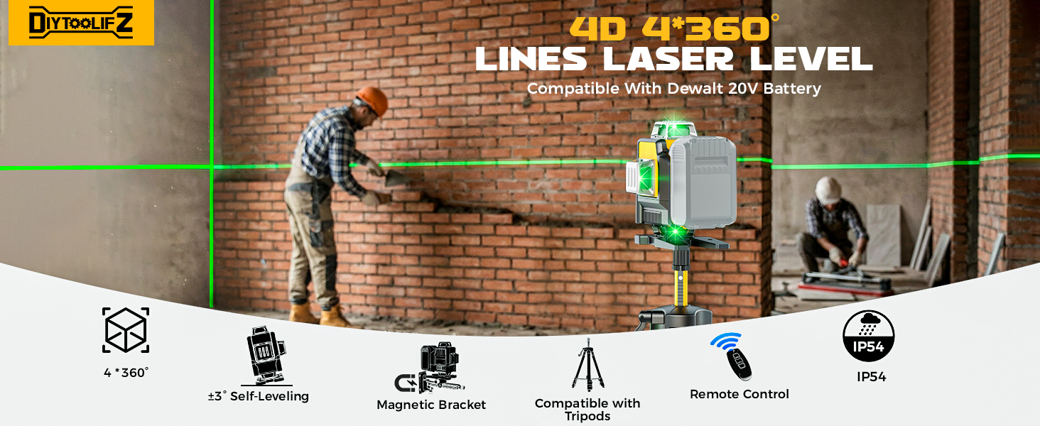 【Compatible with Dewalt 20V Battery & Remote Control】 This laser level compatible with dewalt 20v battery is designed for ultimate convenience – it works seamlessly with your existing 20V batteries (Battery & Charger NOT Included), eliminating the need for extra battery purchases. Paired with a remote control, you can easily switch laser line modes remotely without moving the device, adding unmatched flexibility to this laser level 360 self leveling tool.