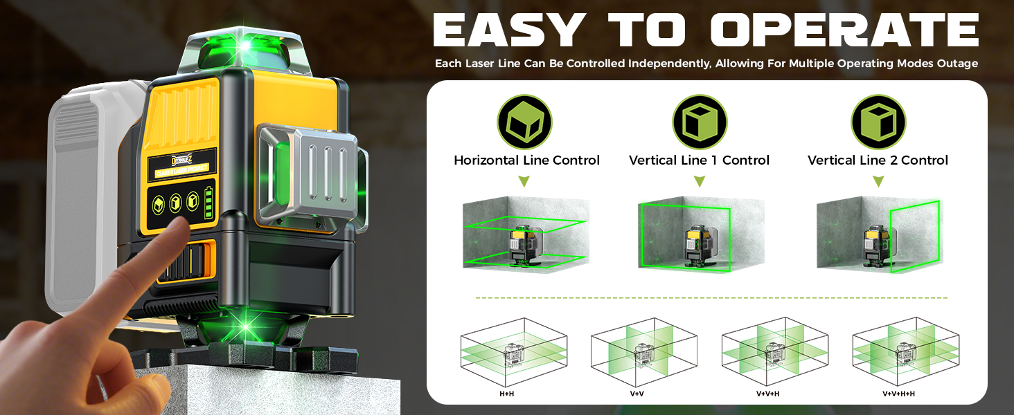 【Ultra-Bright Green Laser with High Precision】 Achieve professional results with this advanced laser level featuring high-visibility green light technology (Wavelength: 515-532nm, Class 2, <1mW). Unlike traditional red beams, this green laser offers superior brightness and visibility. With an accuracy of ±2mm at 33FT, this self leveling laser level ensures pinpoint precision for all your line lasers applications, from picture hanging to complex construction layouts.