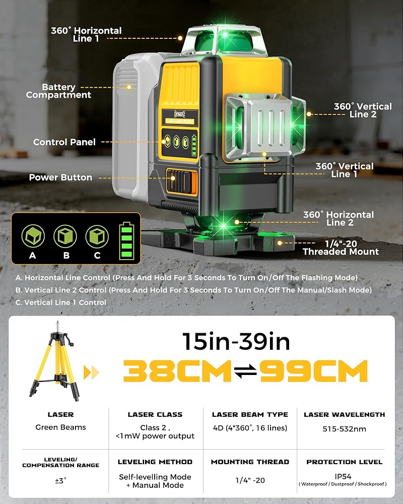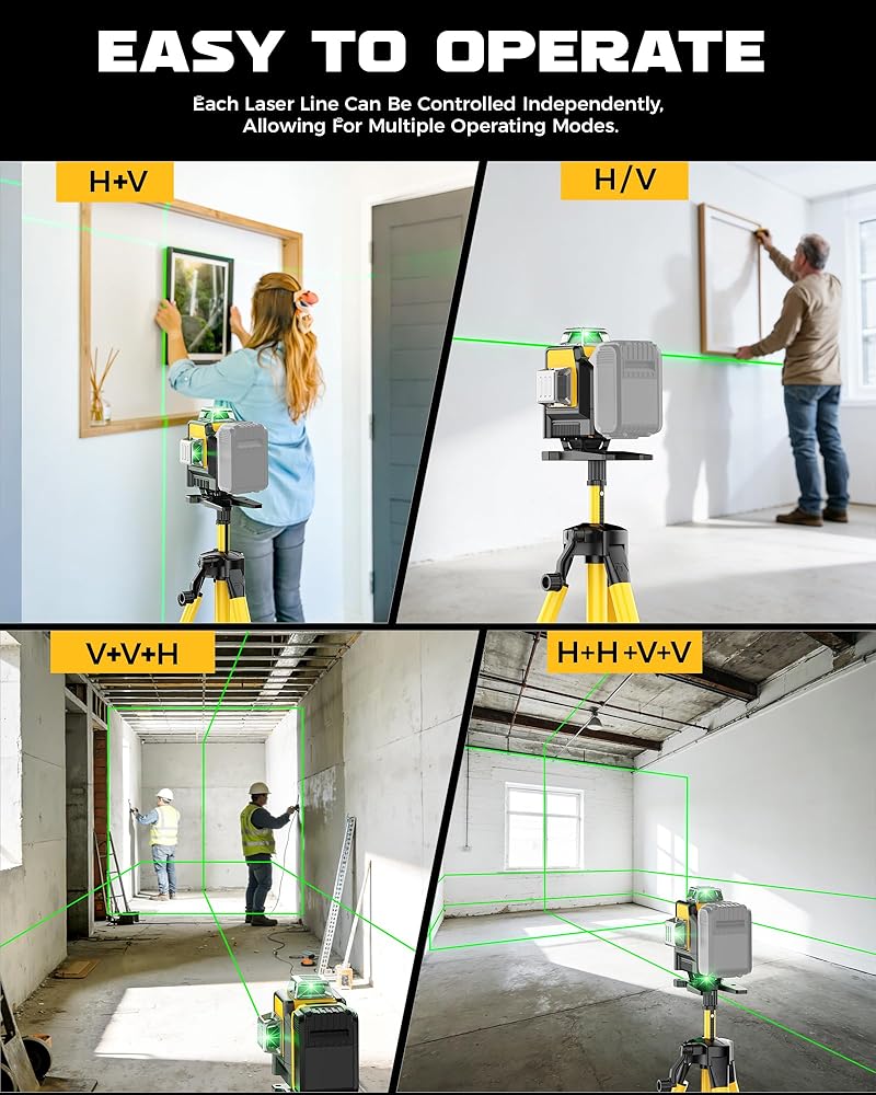 【4D 4x360° Full Room Coverage】 Tackle any job with the most comprehensive coverage available. This 360 laser level projects 16 lines across two horizontal and two vertical planes, creating a complete 4D workspace. As a professional nivel laser 360, it allows you to simultaneously align floors, walls, and ceilings, making it the ultimate leveler tool for complex projects that require more lines than common laser levels.