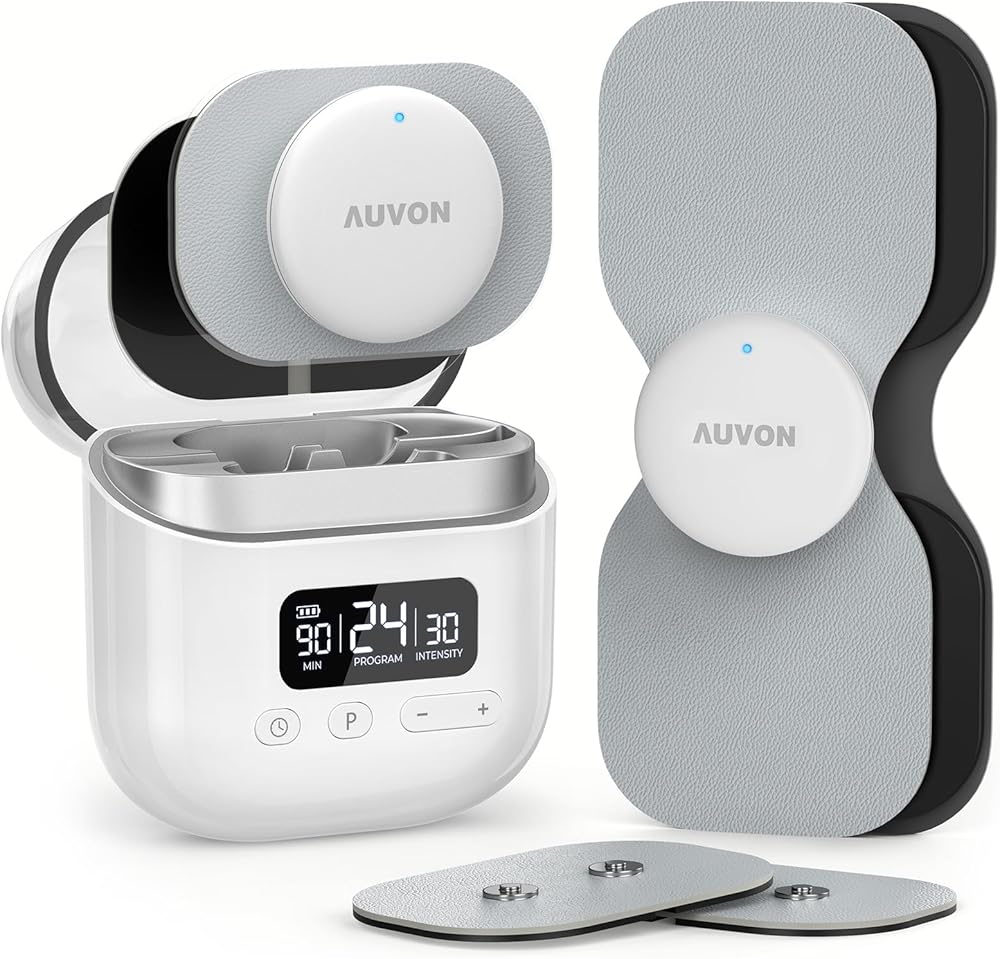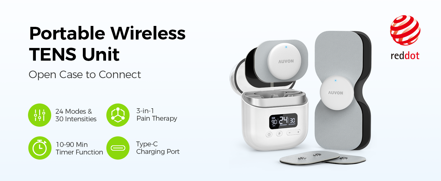 Patented Wireless All-in-One Design for Smart Relief Anywhere: Tired of tangled wires and complex TENS units? This new AUVON wireless muscle massager combines the charging case, pods and TENS pads in one compact and wireless design for easy carrying and use anywhere—home, office, or travel. This TENS device features a clear interface and a readable display, making pain relief intuitive and hassle-free