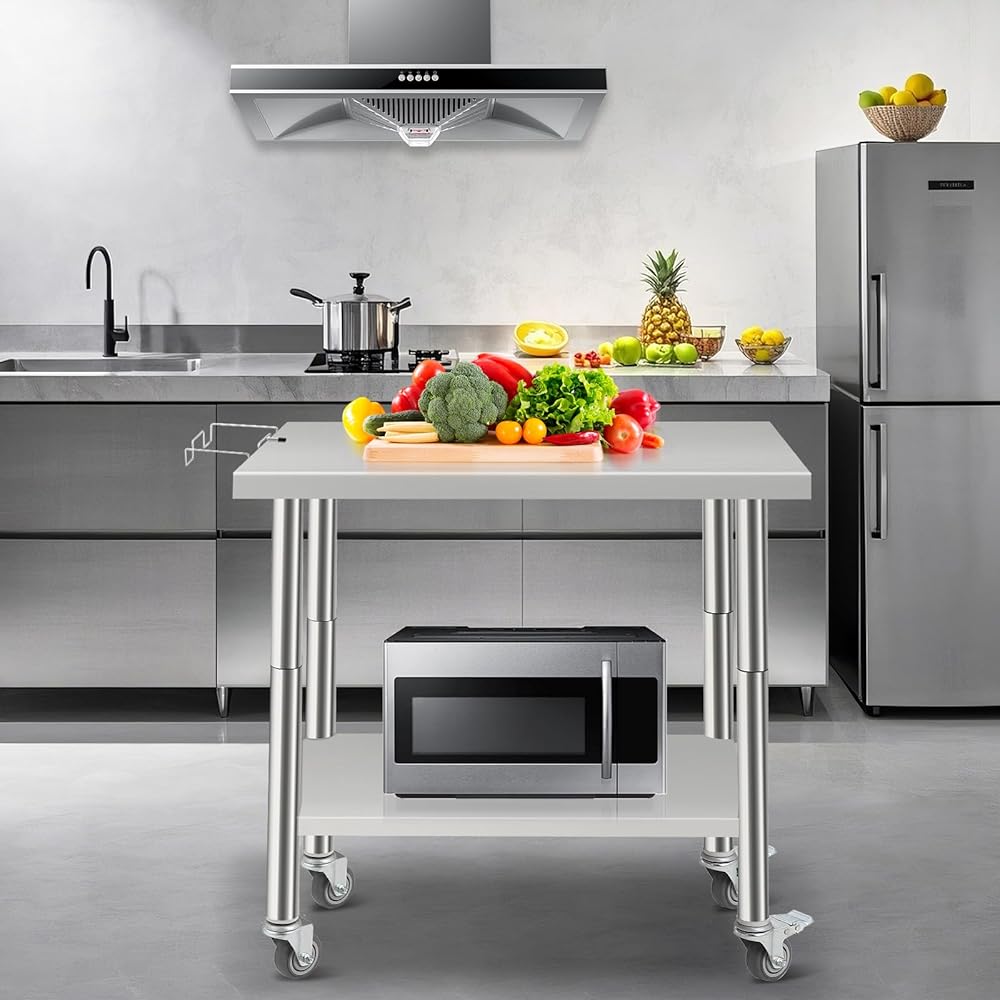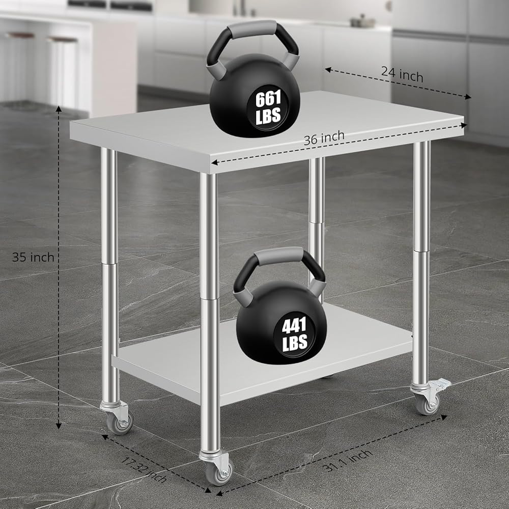 Customizable Storage: Features a height-adjustable undershelf for flexible storage of pots, pans, bulk ingredients, and utensils. Available sizes: 36"x24"x35" and 30"x24"x35".