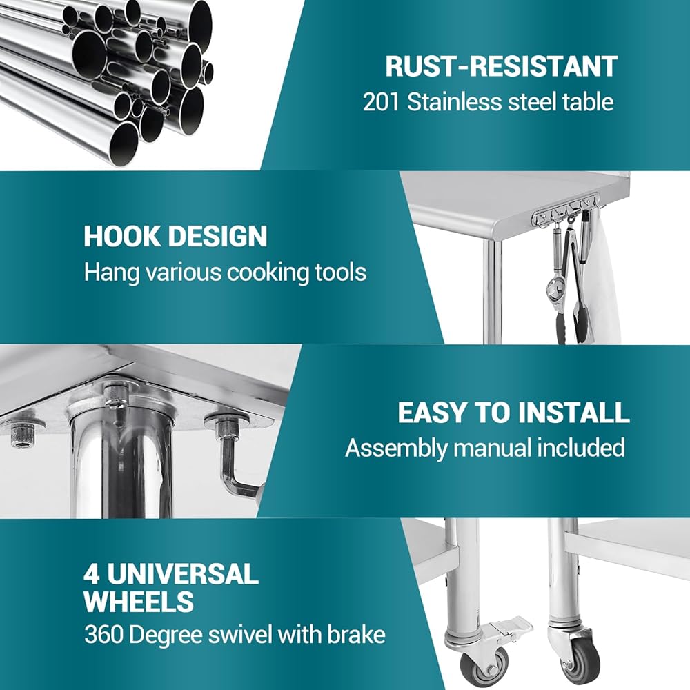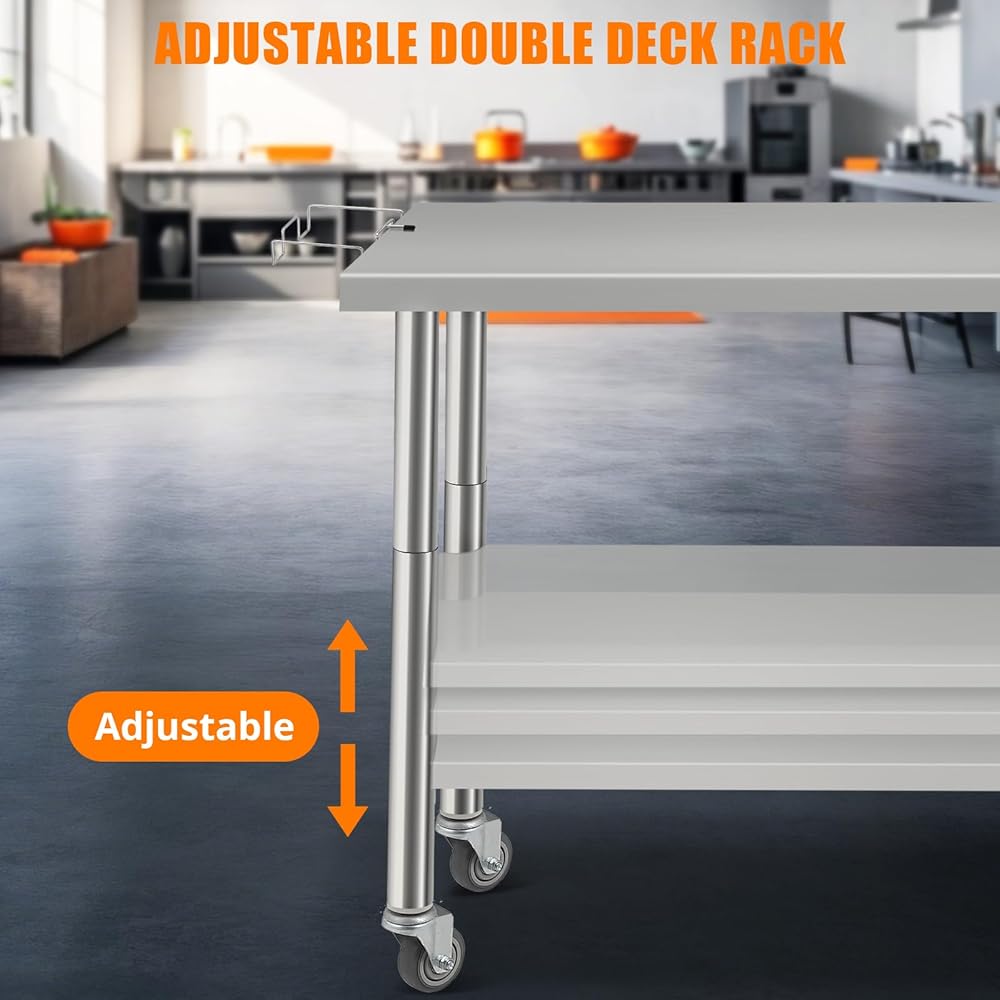 NSF Certified & Hygienic: Crafted from high-quality, corrosion-resistant 430 stainless steel, this table meets strict food safety standards. Its non-porous surface resists rust, is easy to clean, and maintains a sanitary workspace.