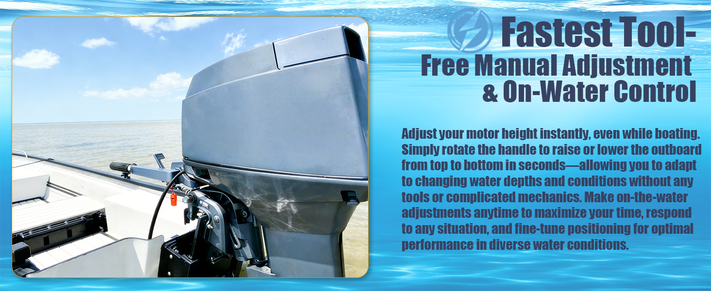 Fastest Tool-Free Manual Adjustment & On-Water Control: Adjust your motor height instantly, even while boating. Simply rotate the handle to raise or lower the outboard from top to bottom in seconds—allowing you to adapt to changing water depths and conditions without any tools or complicated mechanics. Make on-the-water adjustments anytime to maximize your time, respond to any situation, and fine-tune positioning for optimal performance in diverse water conditions