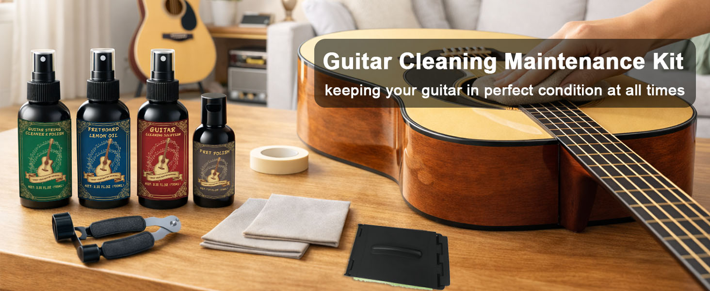 What's In The Package: 100ml guitar string cleaner & polish, 100ml fretboard oil, 100ml guitar cleaner, 50ml Guitar fret polishing paste, 3-in-1 string cutter, Guitar string wiper, masking tape, 2pcs cleaning cloths, and instructions. Guitar cleaning kit includes everything you need to maintain your guitar