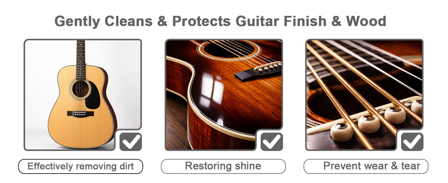 Extend Guitar performance: Guitar string cleaner kit has a gentle formula that protects the finish and wood, preventing fading and environmental damage. Guitar string cleaner & polish (does not repair scratches) adds a protective shine and reduces corrosion, fretboard oil deeply nourishes and prevents cracking, maintaining string resonance and wood stability for long-term performance