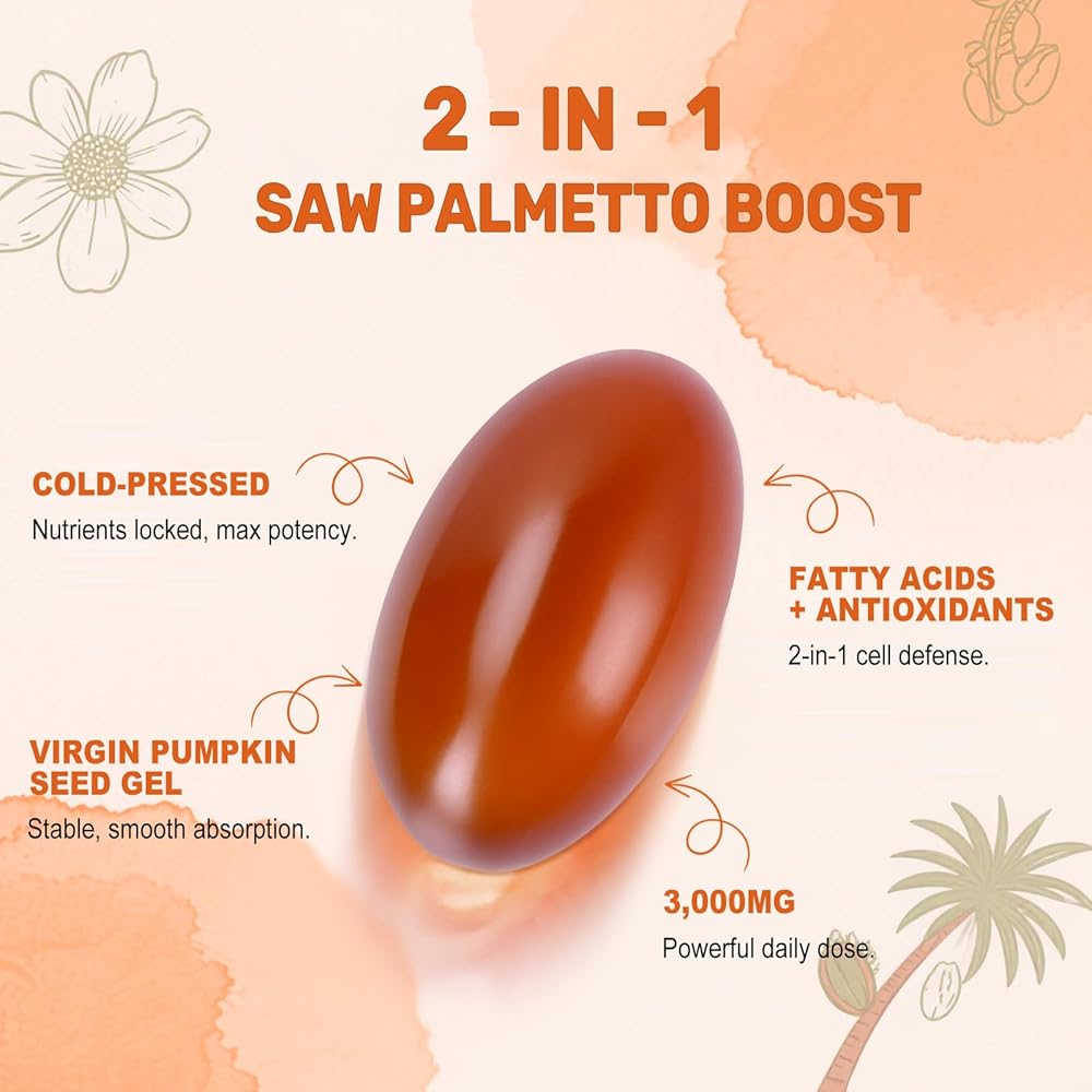 Max-strength 2-in-1 formula combines 3,000mg cold-pressed virgin pumpkin seed oil with 300mg 4:1 saw palmetto extract, retaining essential fatty acids, phytosterols, and antioxidants for optimal potency.