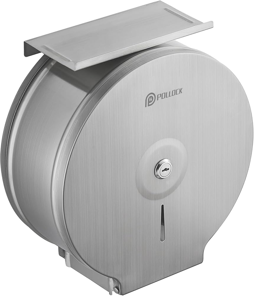 1. Jumbo Toilet Paper Holder with Shelf: The commercial toilet paper dispenser measured 10.43" *9.8”*3.1”, fitting rolls up to 9" outer diameter and cores larger than 2.3". It comes with a stand for your phone, wet wipes, headphones, and more.