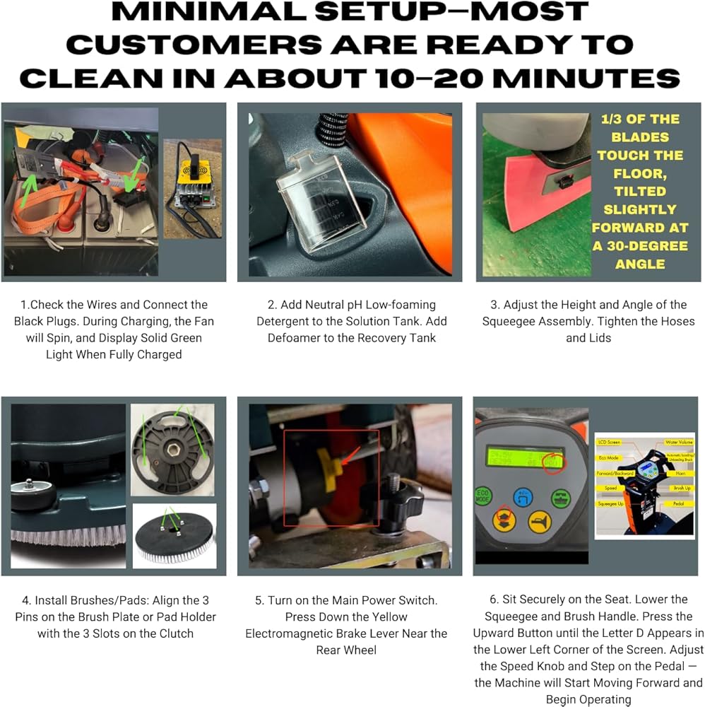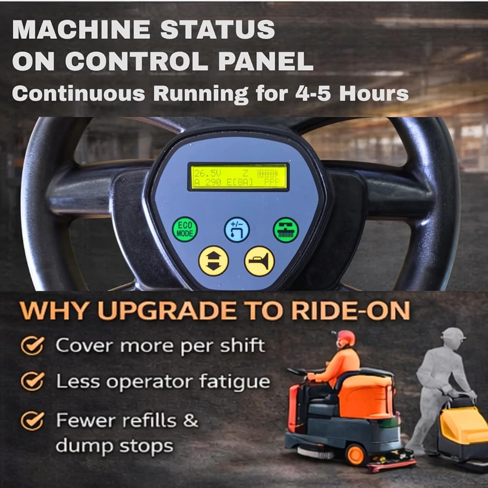 Lower-Noise Operation with Backup Alarm and 2-Year Warranty: With operating noise around 65 dB, a built-in backup alarm, and a 2-year warranty, this ride-on scrubber is built for safer and more confident daily use in busy commercial settings.