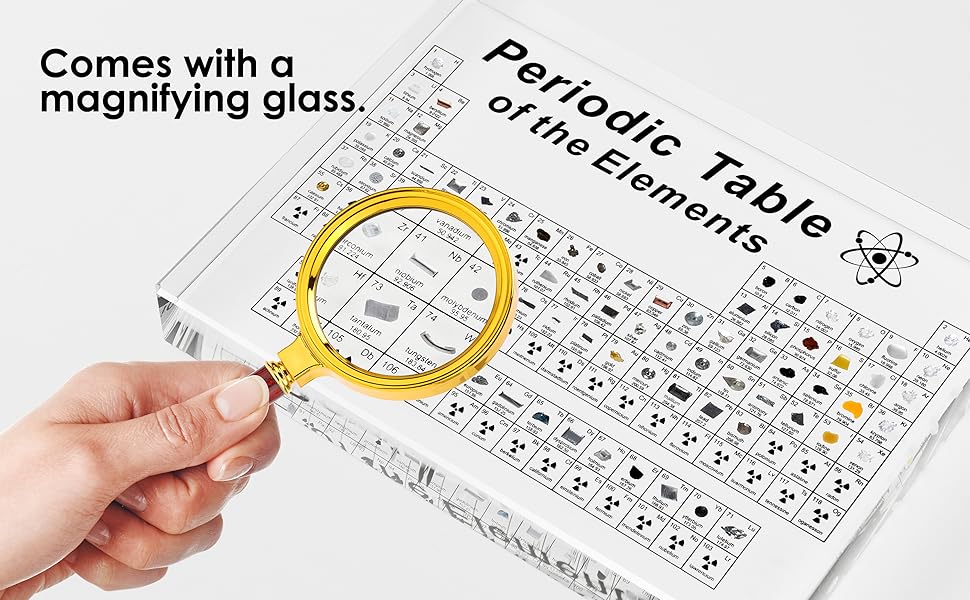 【Wooden Stand & Magnifying Glass】Comes with a wooden base and a magnifying glass. You can use the magnifying glass to see each element sample clearly. With the wooden base, the periodic table can be placed more firmly.