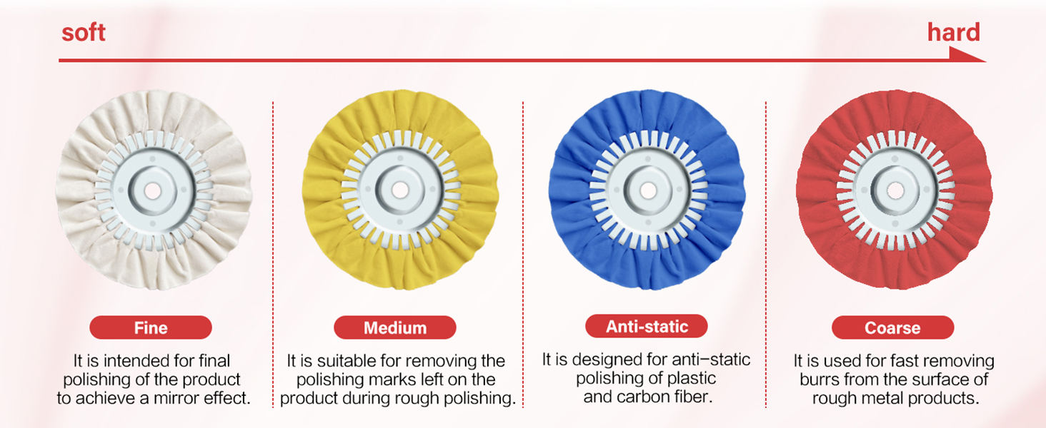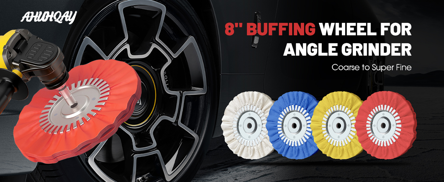 9Pcs Polishing wheel kit: This all-in-one kit includes 4 premium 8" airway buffing wheels (for coarse-to-fine polishing) and 5 color-coded polishing compounds.