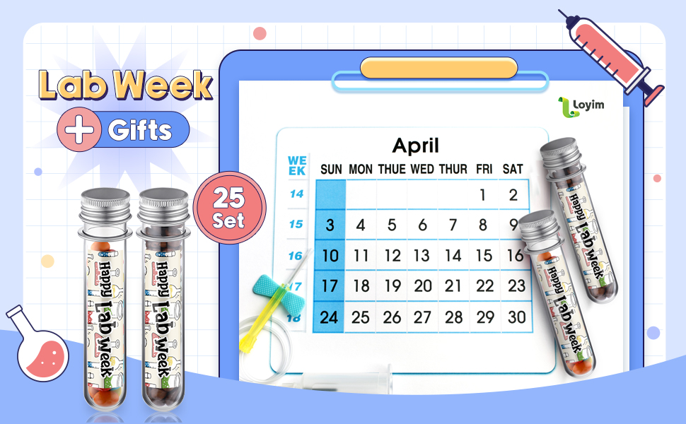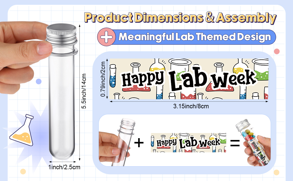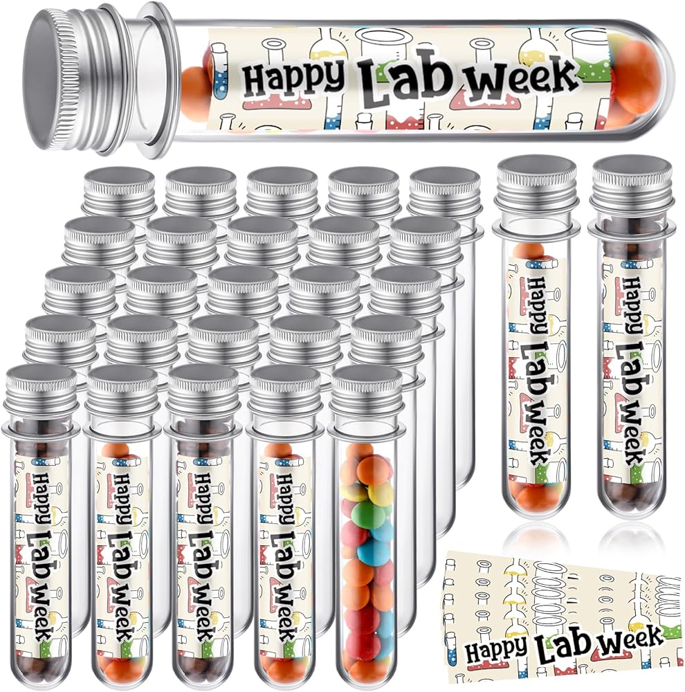 Packing Includes: 25 pieces 45ml (25x140mm) plastic test tubes with screw caps, 25 pcs 2x8cm happy lab week stickers, ideal for lab week decoration, lab week party gifts, science party favors for students, and expressing gratitude and recognition to lab tech professionals