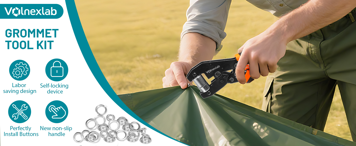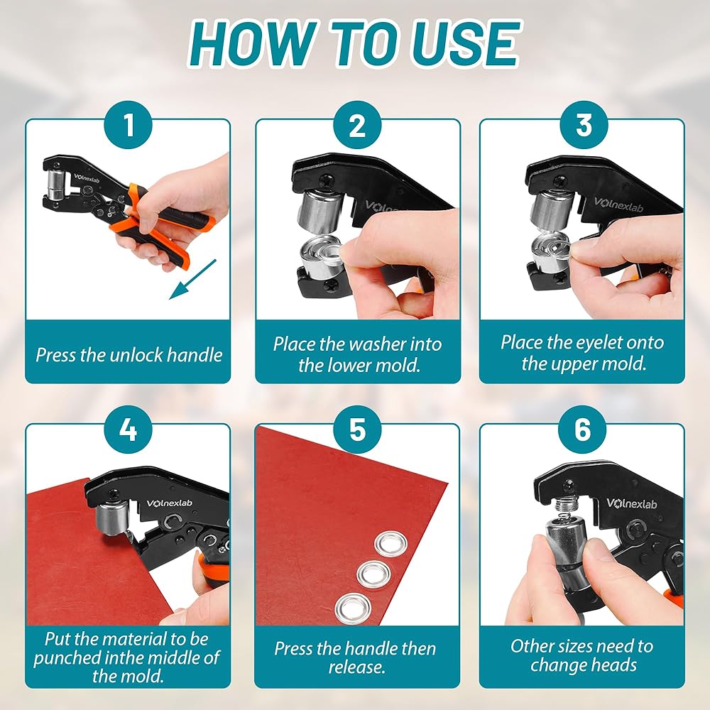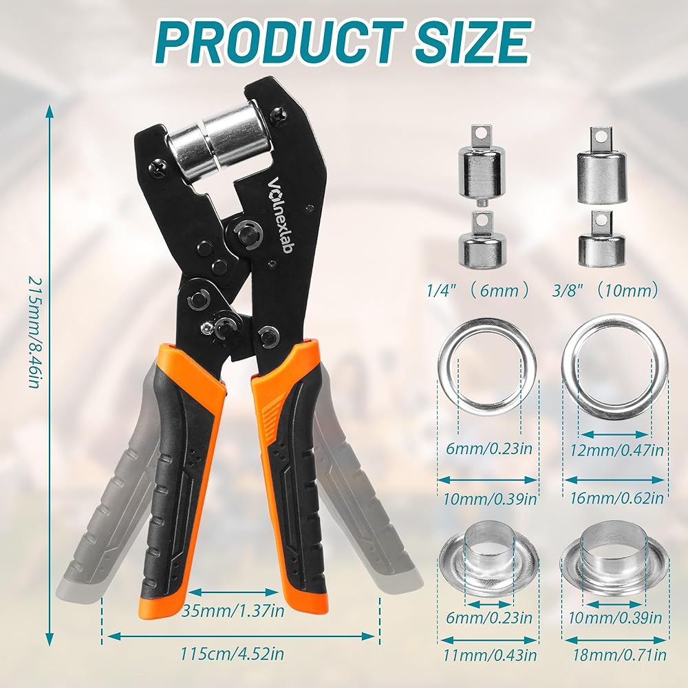 Versatile Multi-Size Design – This grommet tool kit includes interchangeable dies for 1/4" and 3/8" grommets, The magnetic jaws securely hold eyelets and washers in place for quick, precise installation.