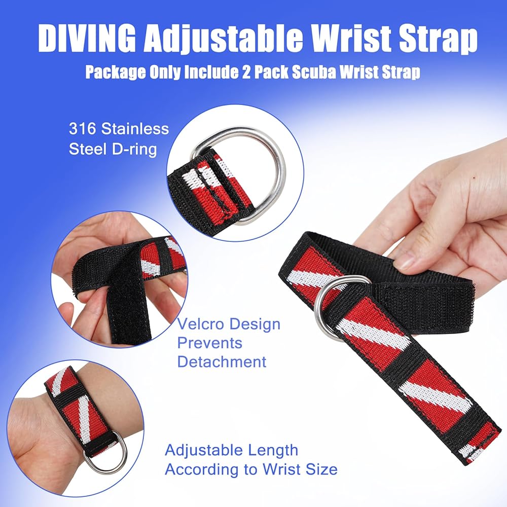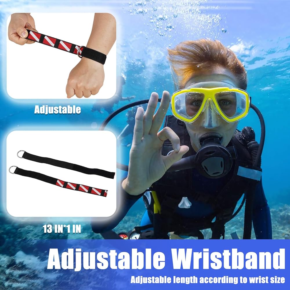 ADJUSTABLE WRIST LANYARD --- The adjustable diving wristband features a Velcro design, making it easy to put on and take off. There is no need to worry about it losing its adhesive properties when wet. The adjustable wristband length of 13 x 1.0 inches allows you to freely adjust the length of the wristband according to the comfort of your wrist, ensuring that diving accessories remain securely in place without the risk of falling off