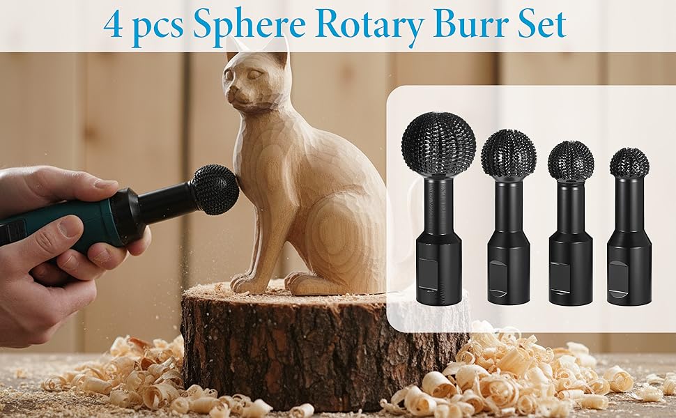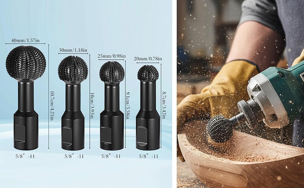 Complete Set With Multiple Sizes: this sphere rotary burr package includes 4 sphere rotary burr attachments with different diameters (20mm/0.79in, 25mm/0.98in, 30mm/1.18in, 40mm/1.57in), featuring 5/8"-11 universal threads for direct installation, providing a versatile range for progressive wood shaping from rough carving to fine detailing