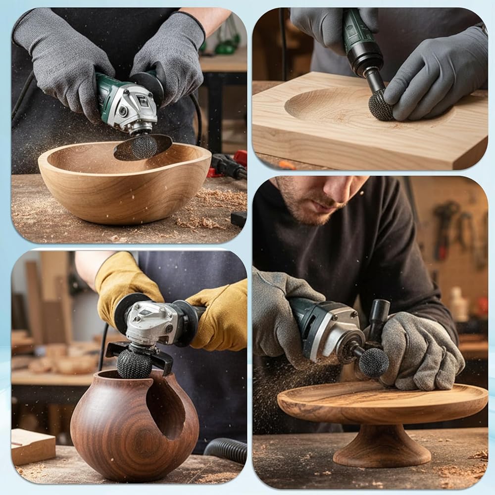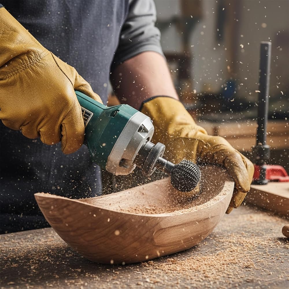 Universal Compatibility And Safe Use: ball gouge angle grinder attachmentsdesigned to fit standard 4.5-inch and 5-inch angle grinders with 5/8"-11 spindle threads without adapters, ensuring vibration-free operation, while always requiring safety goggles, a mask, and heavy-duty gloves during use and the removal of foreign objects like nails from the wood beforehand