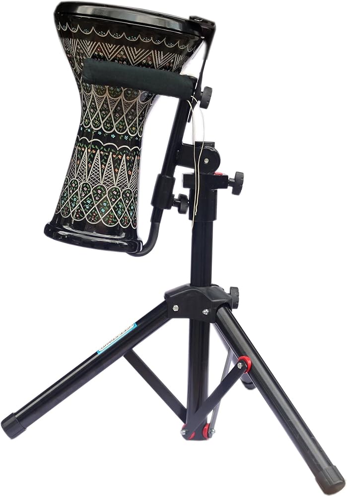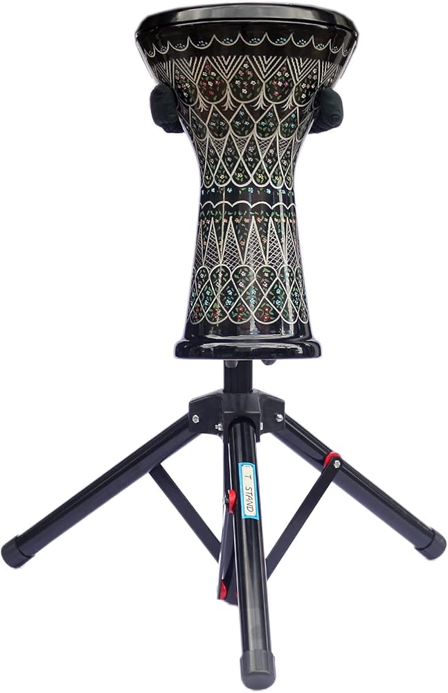 Introducing the adjustable Stand For Darbuka Drum by Sala Muzik, model CSK-302. This durable metal instrument stand is designed to fit all darbuka drums and is equipped with soft foam arms and back rest to protect your instrument from scratches. The 3 metal tripod base provides a secure and stable support, while the rubberized feet ensure stationarity on any floor type. The stand is collapsible for easy transport and storage, making it a convenient choice for musicians on the go. The package includes the stand, soft foam arms and back rest. Experience the perfect blend of functionality and protection with this high-quality darbuka drum stand.