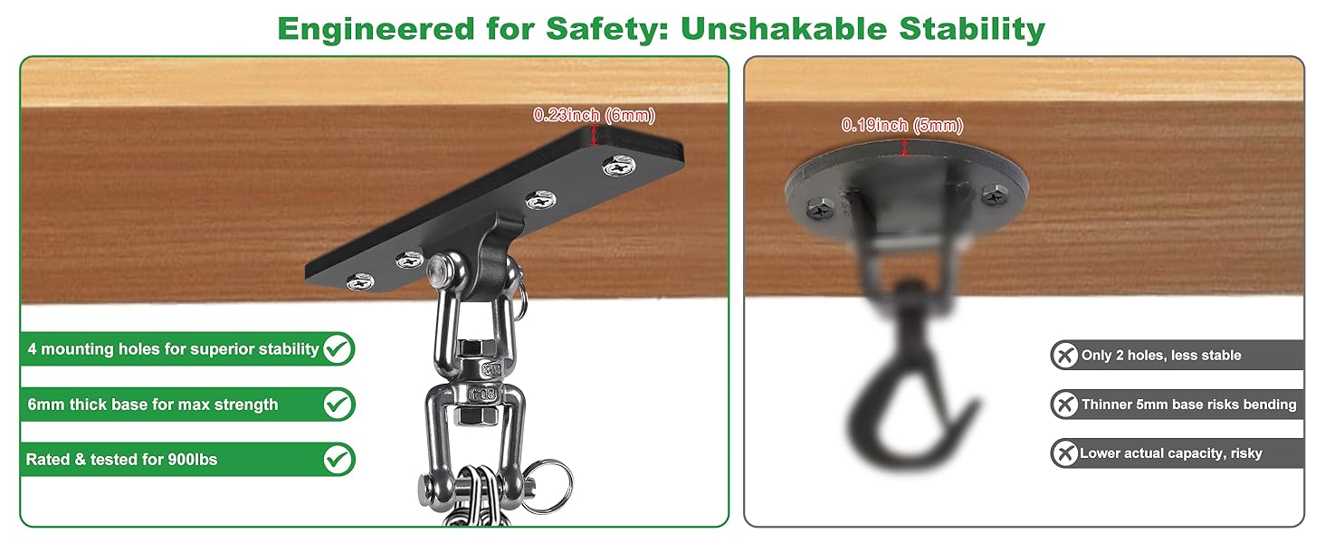 【900LB Heavy-Duty Capacity & Robust Construction】Engineered with 6mm thick, high-strength solid steel and a black rust-proof coating, our heavy bag hanger is built for extreme performance. It confidently supports up to 900 pounds, guaranteeing unwavering stability and safety during the most intense boxing, MMA, or Muay Thai training sessions for years to come.