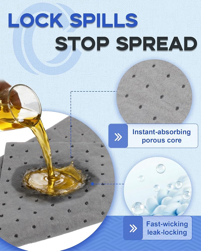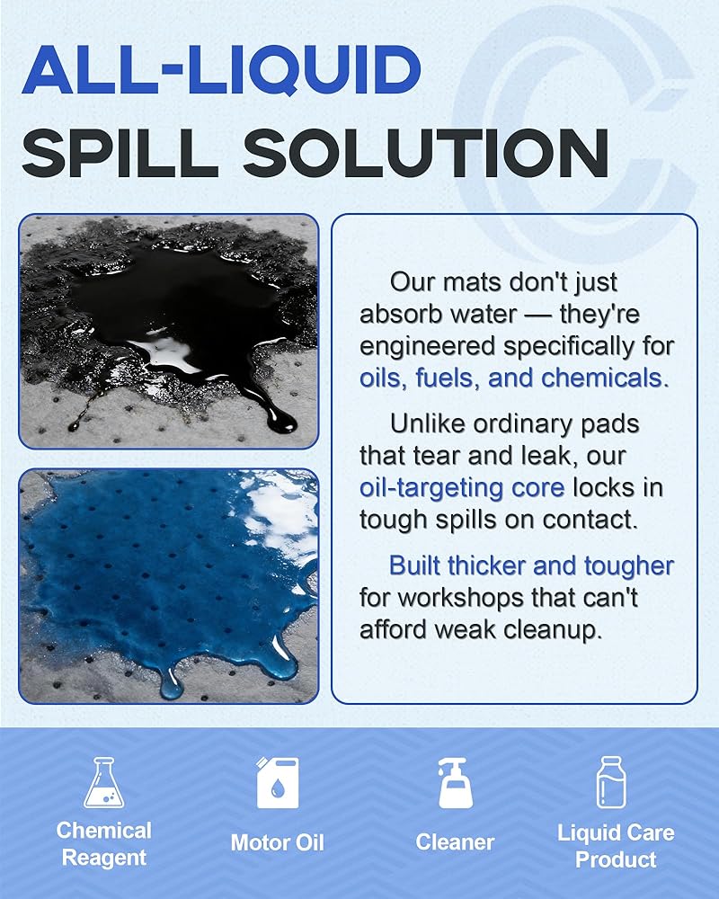 Fast Oil & Water Pickup: Quickly absorbs motor oil from garages, hydraulic fluid and coolant from workshops, cooking grease from kitchens, disinfectants from cleaning, and pet urine from floors